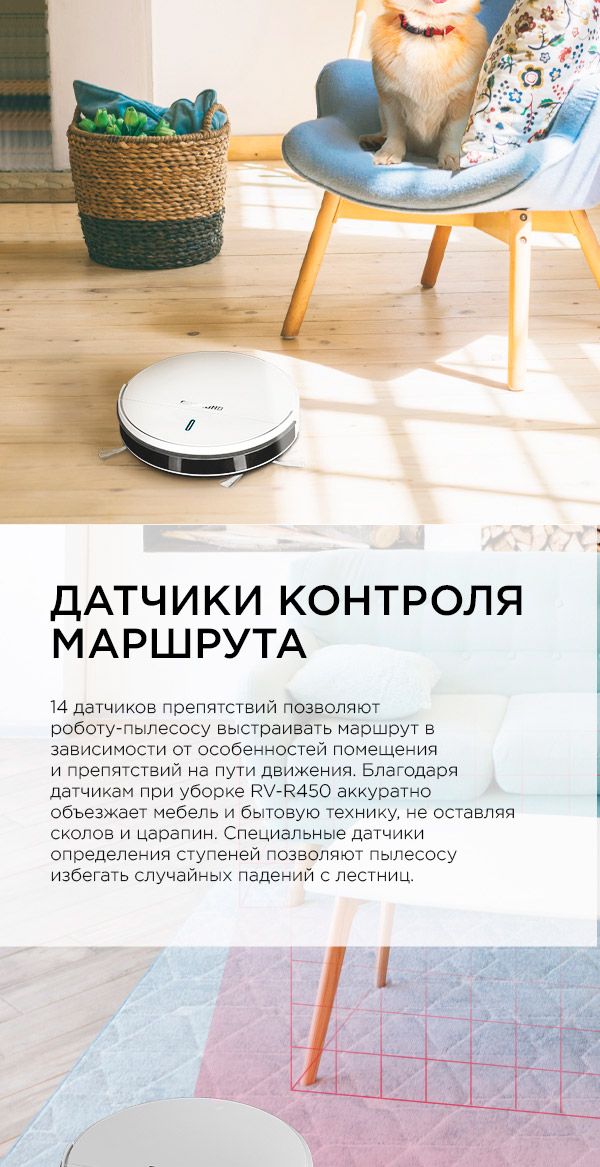 Передвижение робота-пылесоса контролируют 14 встроенных датчиков определения препятствий. Благодаря им RV-R450 точно распознает стены, мебель, бытовую технику и другие преграды на пути. Высота пылесоса всего 7,5 см, за счет этого прибор с легкостью очищает труднодоступные места под диваном или тумбой.