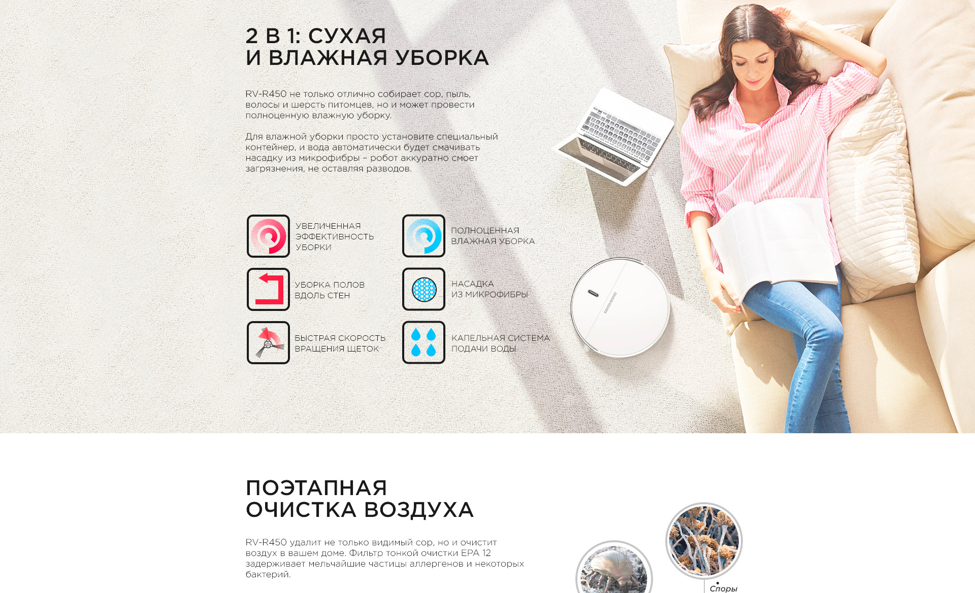 RV-R450 может провести как сухую, так и влажную уборку: для этого в комплекте предусмотрены две щетки, насадка из микрофибры и специальный контейнер для воды. Боковые щетки тщательно очищают поверхность от пыли, волос и шерсти домашних животных, они выходят за диаметр корпуса и хорошо захватывают сор даже в углах. При влажной уборке вам не придется постоянно смачивать насадку, вода будет автоматически поступать из контейнера.