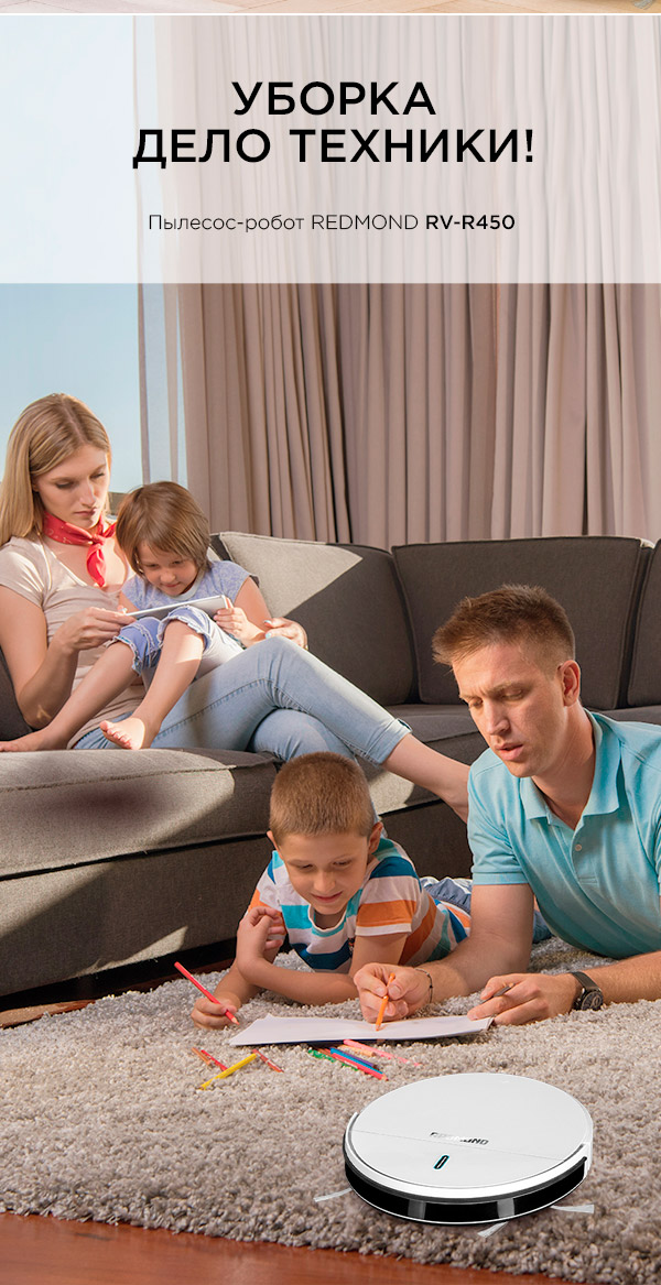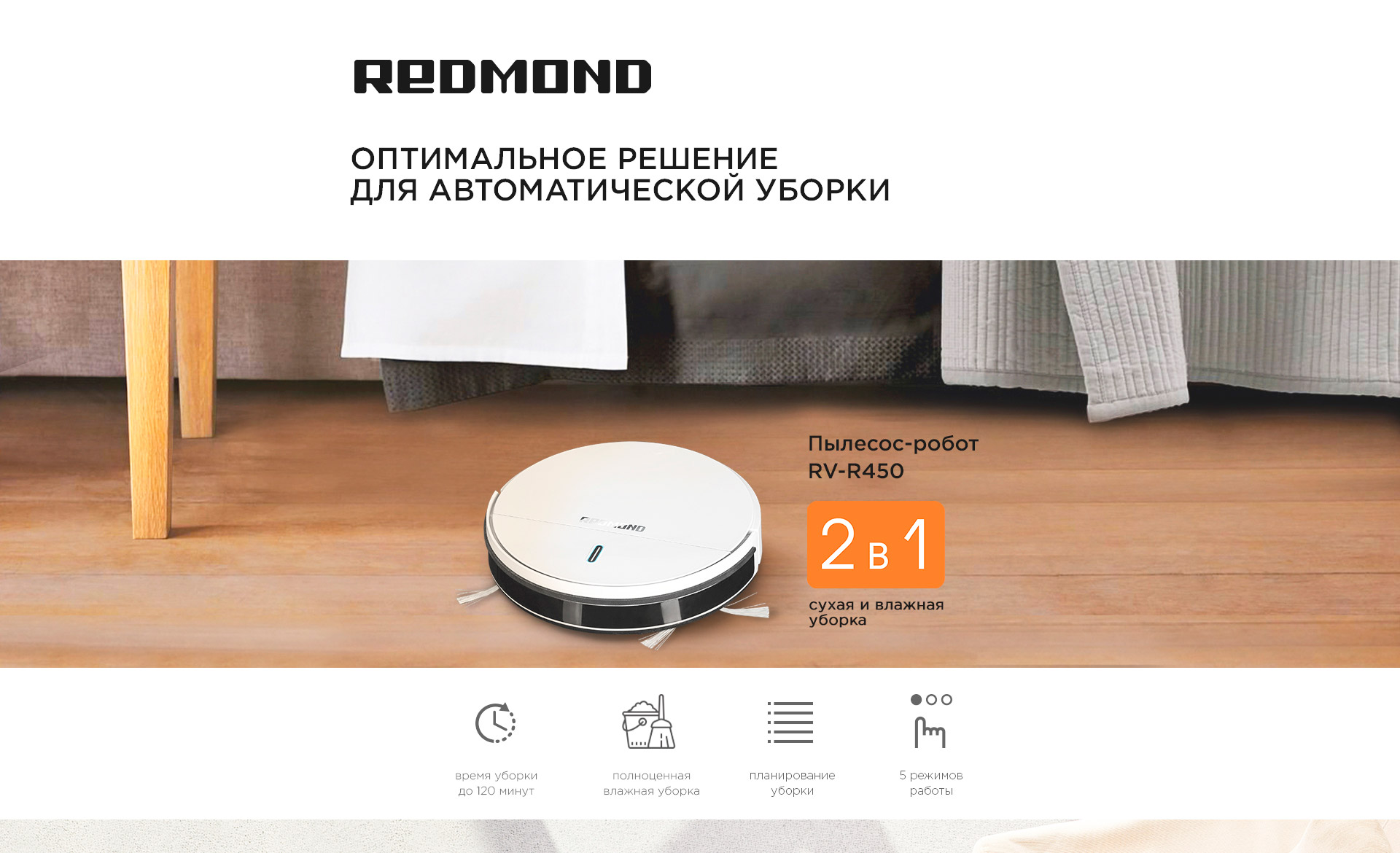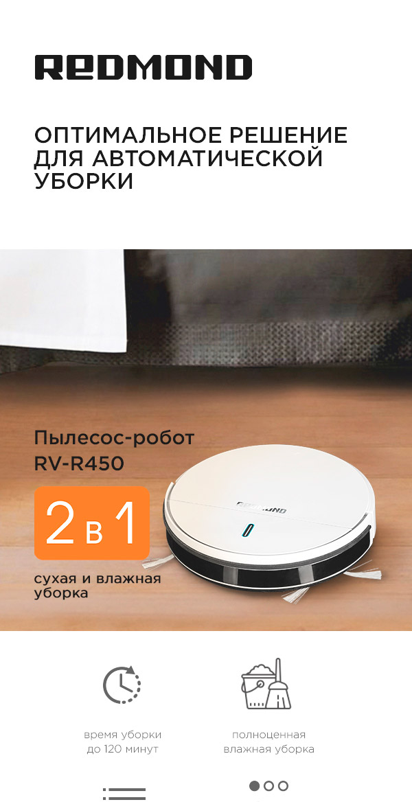 REDMOND RV-R450 – робот-пылесос «2 в 1» для сухой и влажной уборки напольных покрытий в доме или офисе. В отличие от моделей предыдущего поколения, RV-R450 оснащен съемным контейнером для воды. Благодаря тому, что насадка непрерывно смачивается водой, влажную уборку робот-пылесос проводит тщательно и качественно – пылесос удаляет загрязнения с гладких полов и не оставляет разводов.