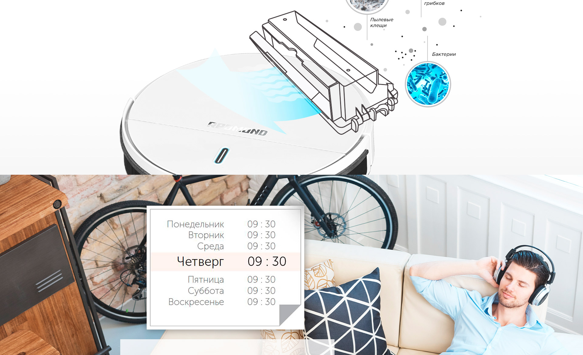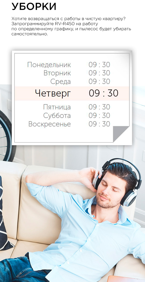 Робот-пылесос может убираться ежедневно в установленное время. Например, запланируйте уборку за час до вашего возвращения с работы, и к вашему приходу дом будет чистым.