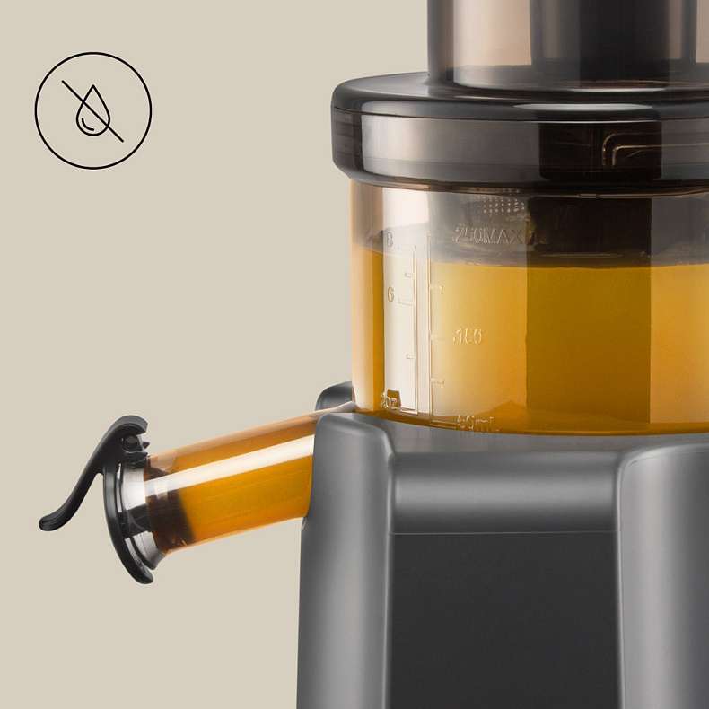 Позволяет перекрыть носик подачи сока сразу после отжима. Это помогает избежать капель на столешнице и сохранить рабочую поверхность чистой — без необходимости подставлять посуду.