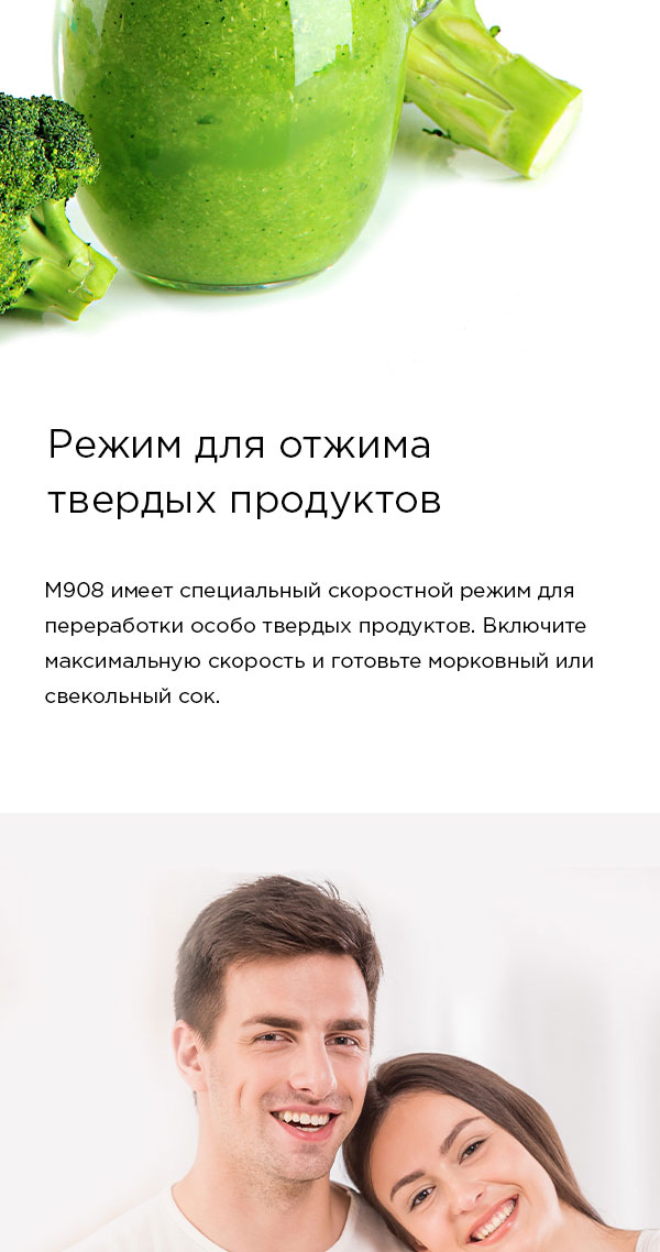 Соковыжималка M908 поразит плавным пуском двигателя и низким уровнем шума во время работы. Удобное механическое управление и яркий стильный дисплей позволят легко выбрать одну из пяти скоростей работы. В устройстве предусмотрена защита от включения при неправильной сборке и защита от перегрева двигателя.