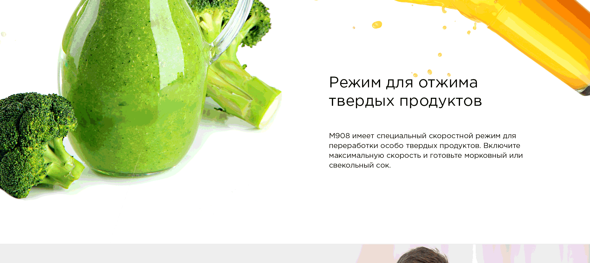 M908 имеет специальный скоростной режим для переработки особо твердых продуктов. Включите максимальную скорость и готовьте морковный или свекольный сок.