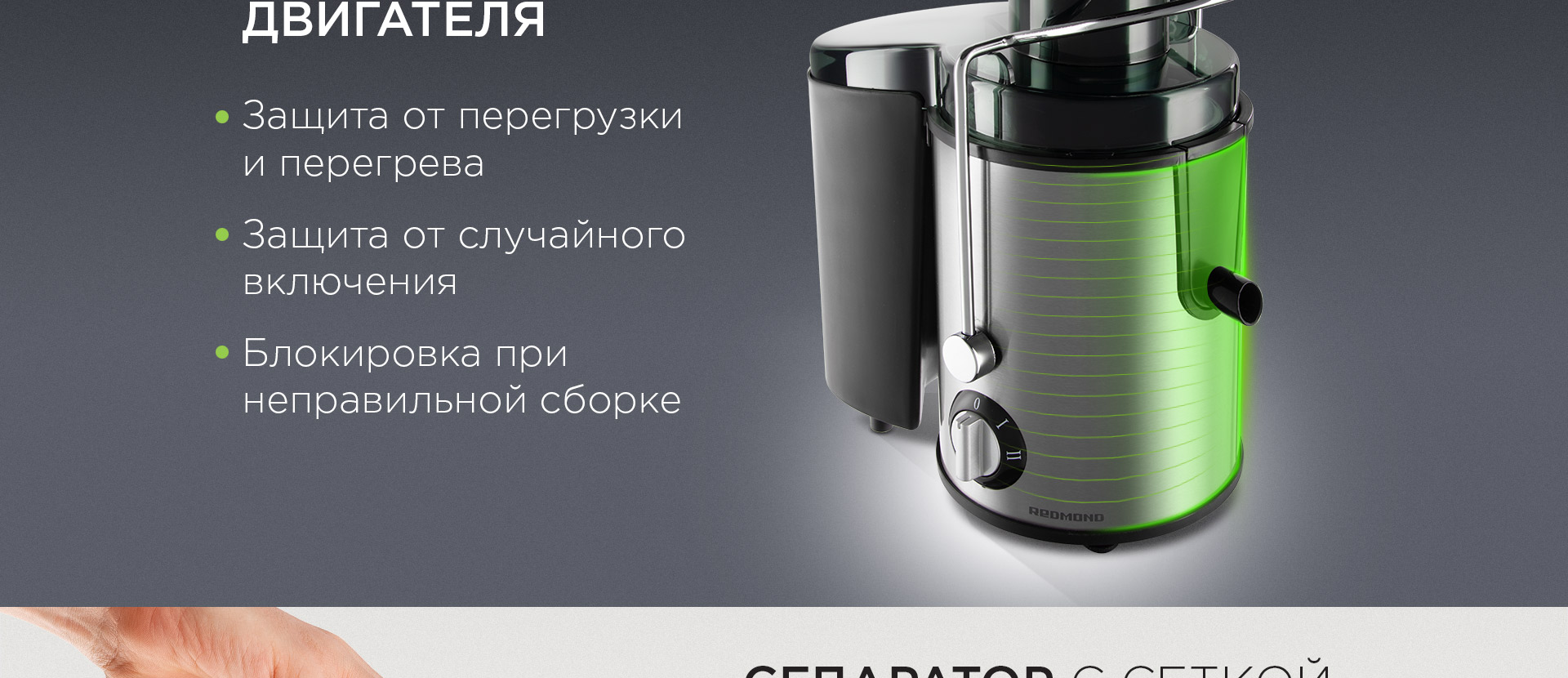 Чтобы прибор не скользил по столу во время работы, производители REDMOND снабдили RJ-M911 прорезиненными ножками. Кроме того, в соковыжималке предусмотрена функция блокировки включения при неправильной сборке устройства. Также RJ-M911 автоматически выключается, когда возникает угроза перегрева двигателя.