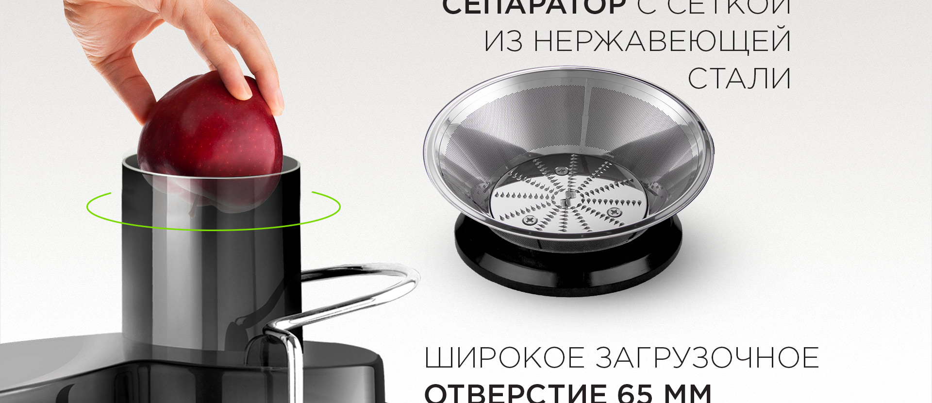 Отверстие для загрузки продуктов диаметром 65 мм позволяет погружать некоторые плоды целиком – это экономит ваше время на подготовку ингредиентов к отжиму. Например, очищенные от кожуры мандарины и лимоны, небольшие томаты вы можете помещать для отжима, предварительно не разрезая их. А крупные продукты до подачи в соковыжималку достаточно разрезать на несколько частей.