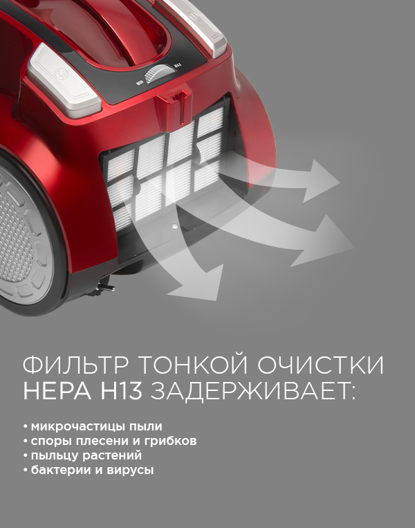 RV-С343 не только удаляет мелкий сор с видимых поверхностей, но и делает чище воздух в вашем доме. Крупные соринки оседают на дне контейнера-пылесборника, а освободившийся воздух проходит через фильтр тонкой очистки НЕРА Н13 – он задерживает мелкодисперсную пыль и большинство воздушных аллергенов. Когда фильтр загрязнится, просто снимите его и промойте.