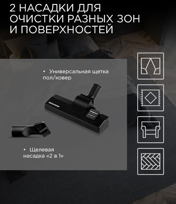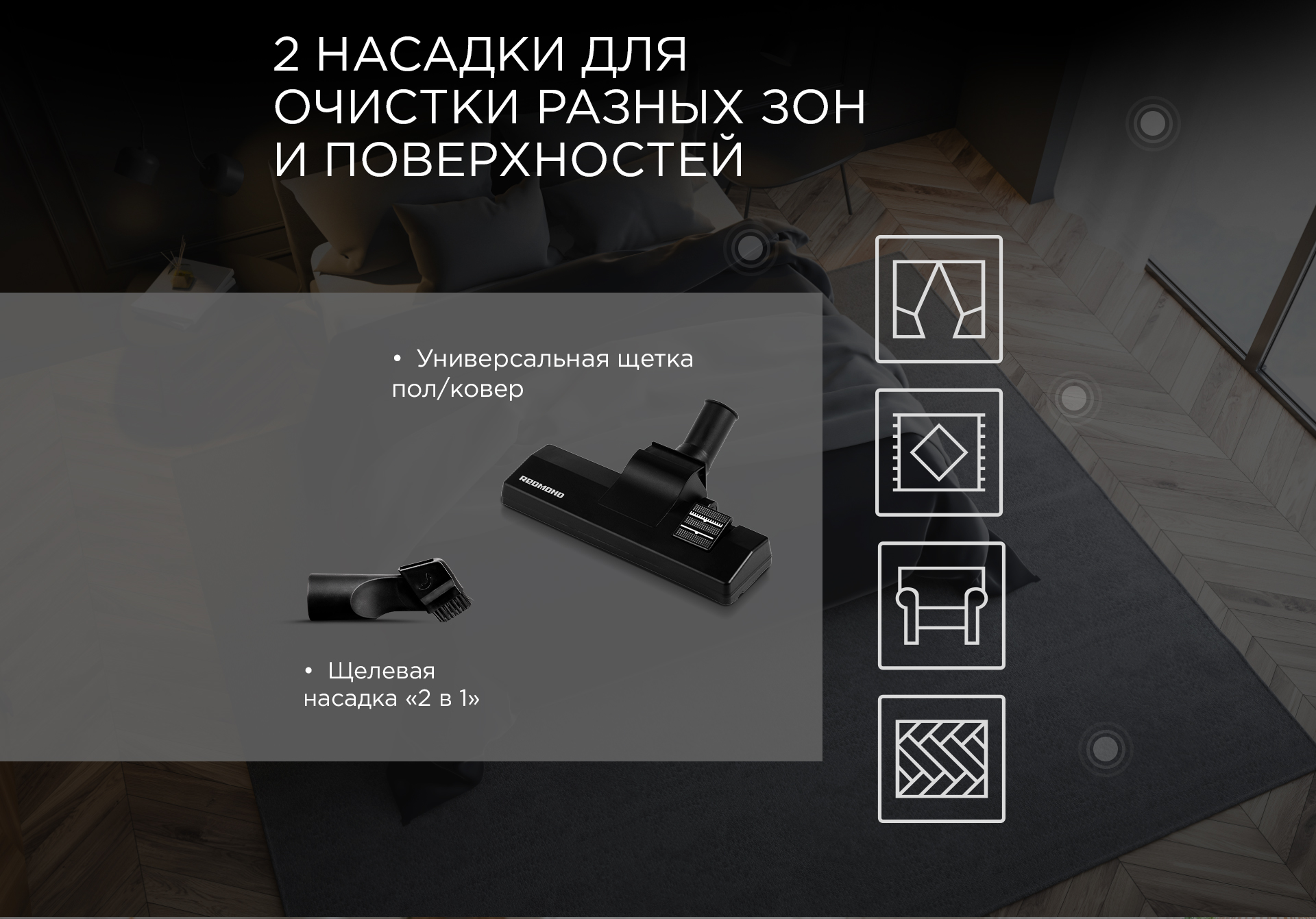 В комплекте пылесоса 2 насадки: универсальная щетка для устранения пыли с гладких полов и ковровых покрытий; и щелевая насадка «2 в 1», благодаря которой пылесос удаляет сор даже из труднодоступных мест.