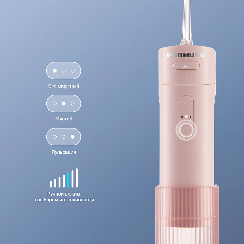 Четыре режима работы — стандартный, мягкий, пульсирующий и ручной — позволяют подобрать оптимальный вариант под индивидуальные особенности. Ориентируйтесь на чувствительность десен, плотность межзубных промежутков и комфортный уровень давления струи.