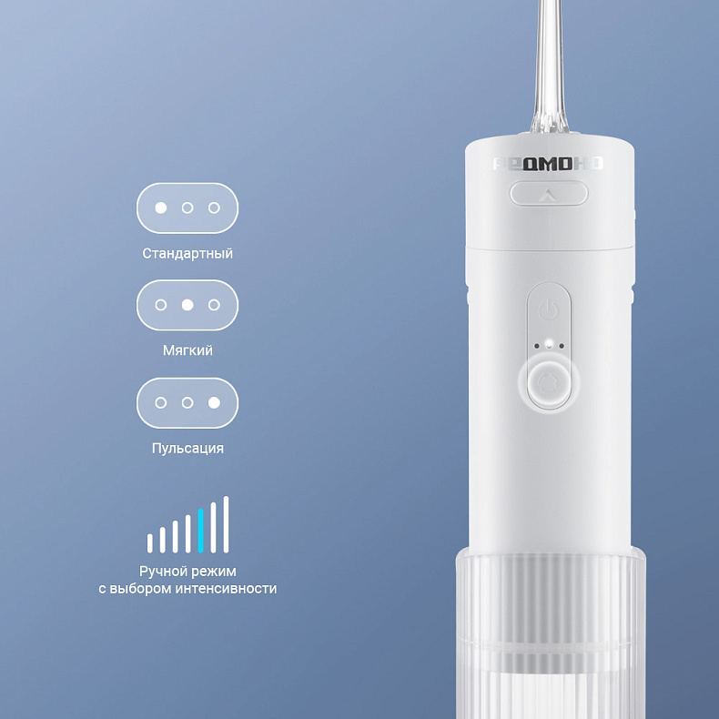 Четыре режима работы — стандартный, мягкий, пульсирующий и ручной — позволяют подобрать оптимальный вариант под индивидуальные особенности. Ориентируйтесь на чувствительность десен, плотность межзубных промежутков и комфортный уровень давления струи.