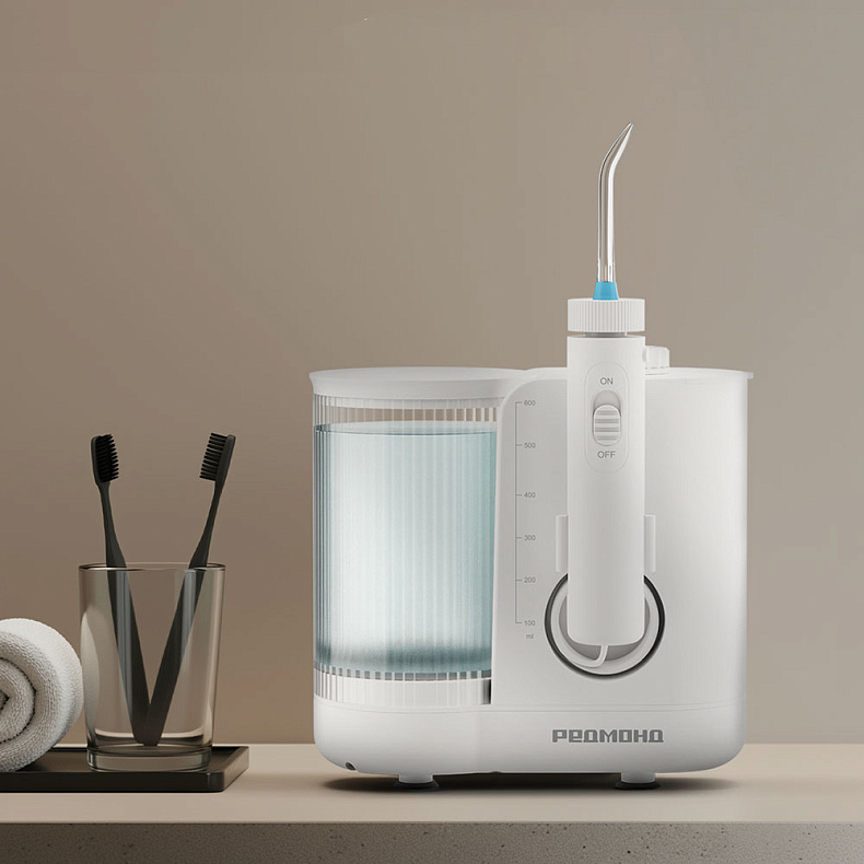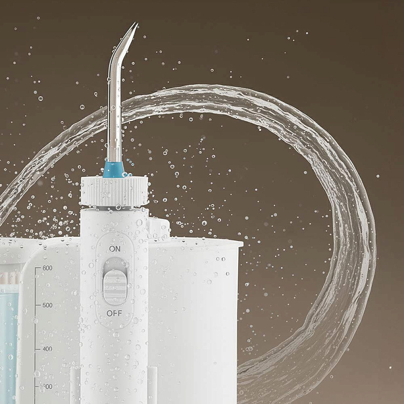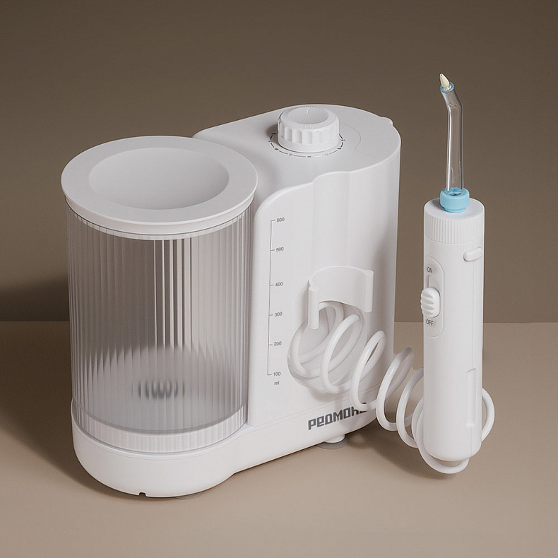 Ирригатор оснащен вместительным резервуаром на 600 мл, которого хватает для полноценной чистки без дозаправки. Благодаря нескользящим ножкам он устойчив даже на влажной поверхности, что обеспечивает безопасное и комфортное использование. А длинный шланг с ручкой 130 см и шнур питания 150 см дают свободу движений.