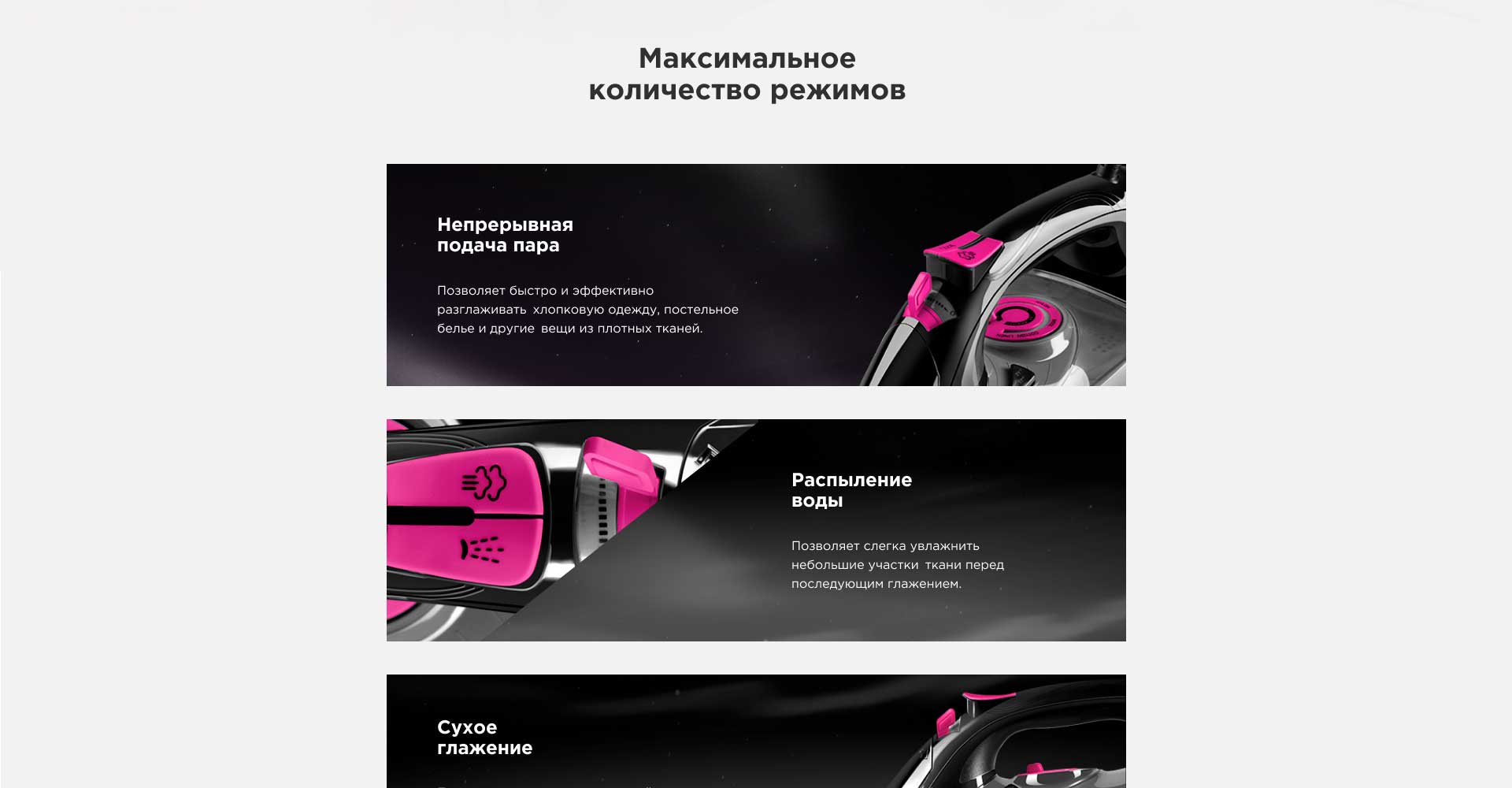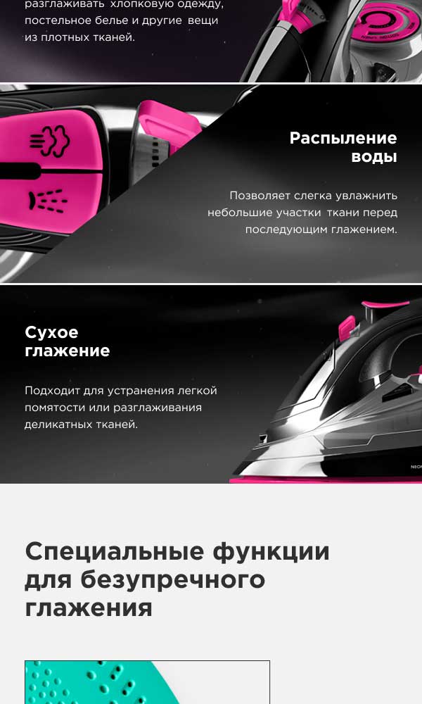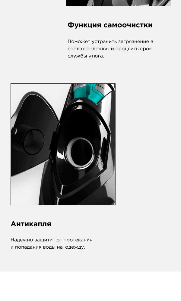 Благодаря функции «Антикапля» вы можете после отпаривания шерстяных брюк перейти в режим сухого глажения, чтобы освежить легкую шифоновую блузку. И вам не нужно будет беспокоиться, что вода, которая осталась в резервуаре, может протечь и оставить разводы на деликатной ткани.