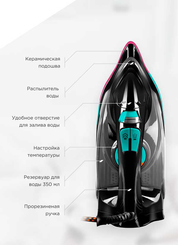 Подошва утюга с керамическим покрытием скользит легко и гладко, благодаря чему вы без особых усилий разгладите даже самую мятую, грубую и капризную ткань.