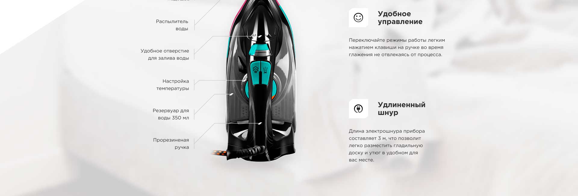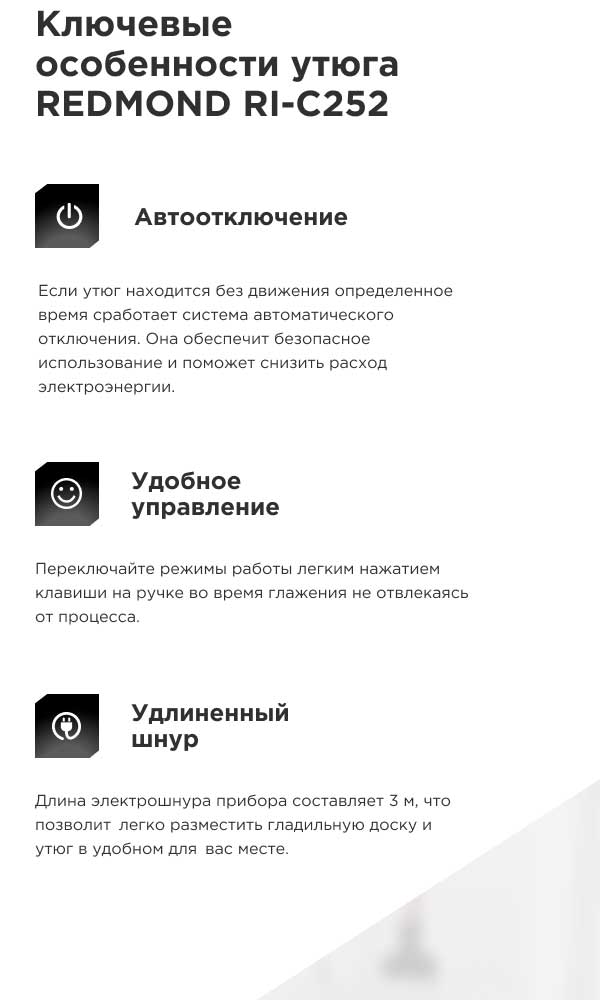 Длина электрошнура прибора составляет 3 м, что позволит легко разместить гладильную доску и утюг в удобном для вас месте.