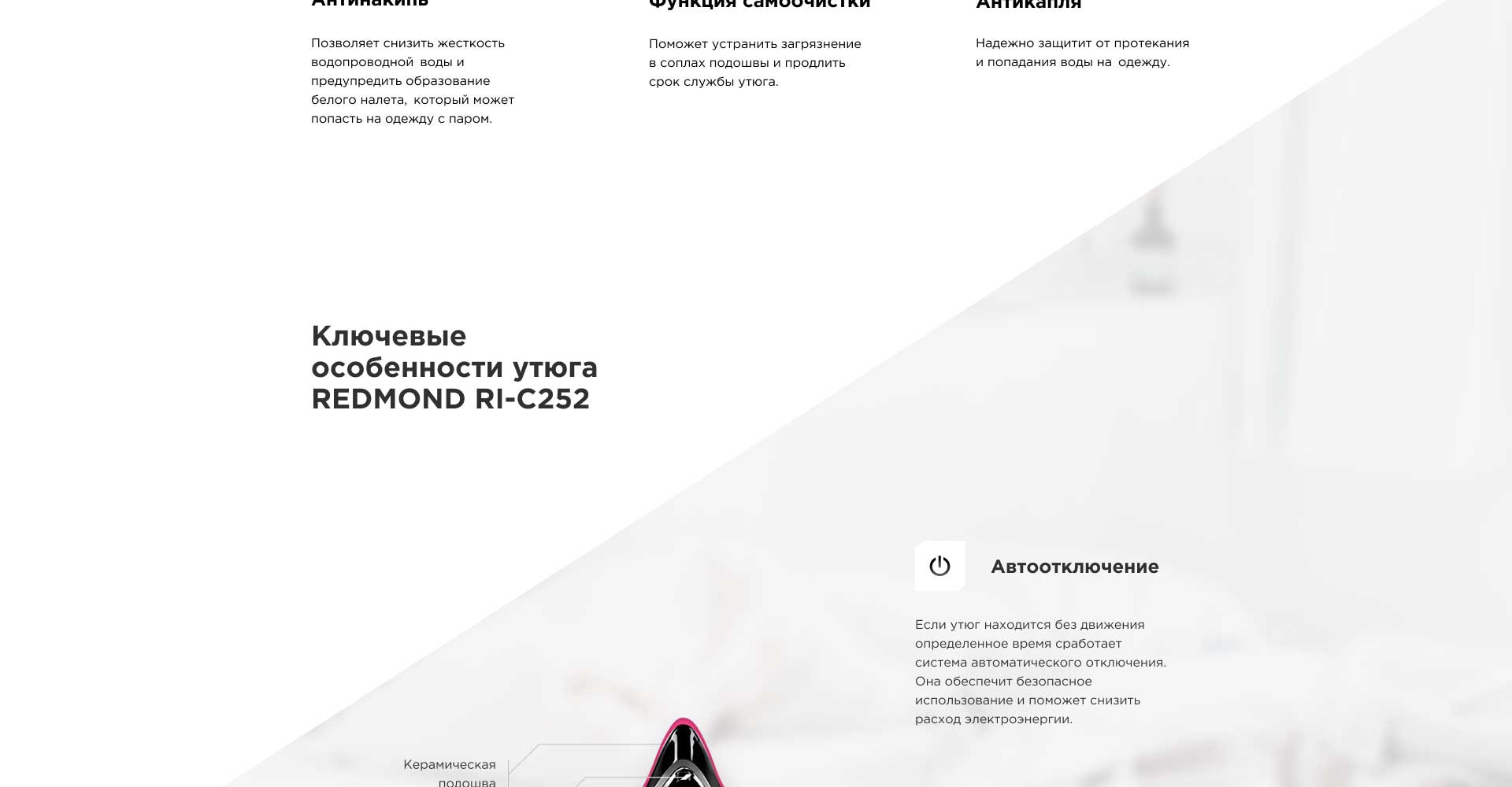 При использовании парового удара, образовавшийся в соплах подошвы утюга налет может попасть на ткань и испачкать ее. Во избежание подобной неприятности, в RI-C252 встроена защита от накипи, которая предупреждает появление белого налета. Для дополнительной защиты предусмотрена функция самоочистки, которая поможет устранить белый налет в подошве прибора.