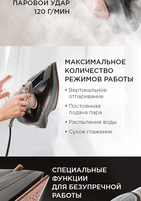 Мощный паровой удар способен разгладить даже самые сильные складки и замятия. Интенсивный поток пара под давлением проникает в волокна материи, смягчая и распрямляя заломы. Функцией также можно воспользоваться для быстрого утюжения сложных участков – воротничков, манжет и ткани около пуговиц.