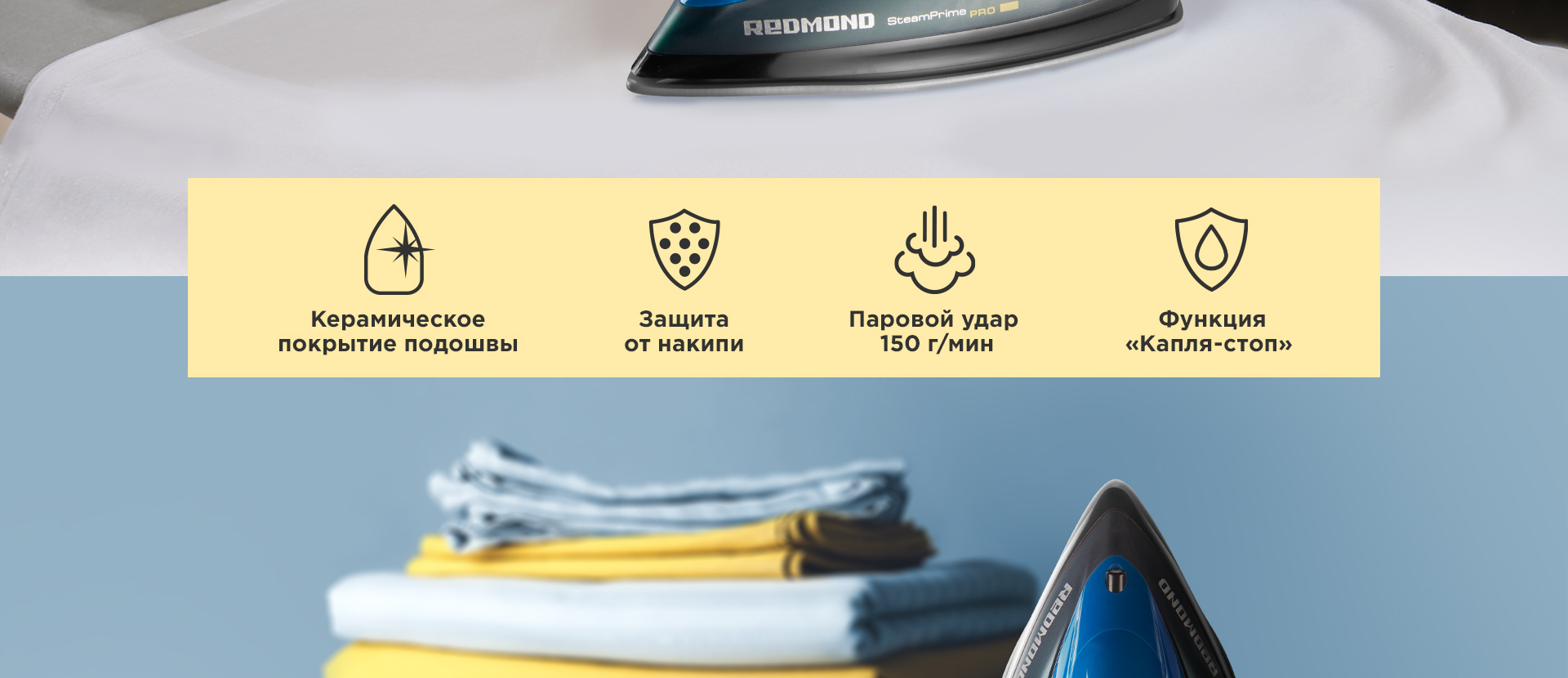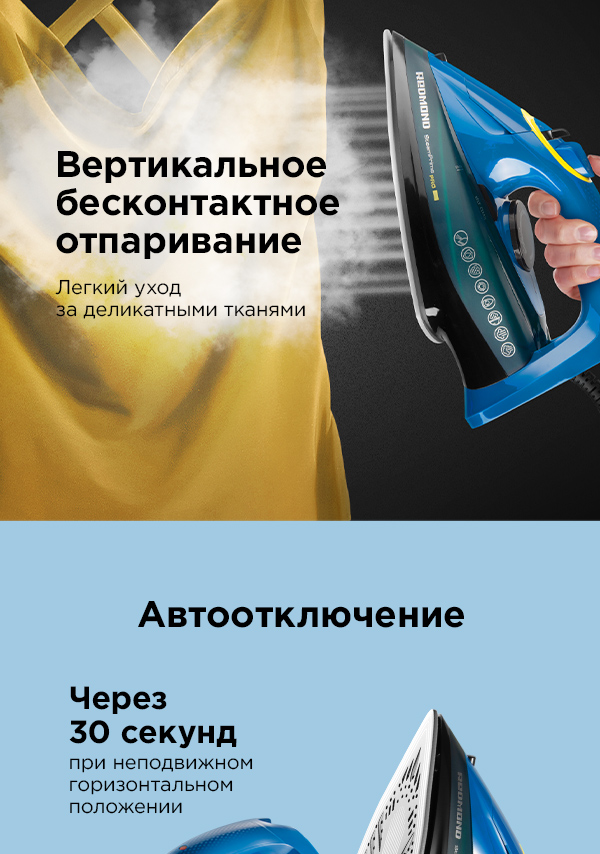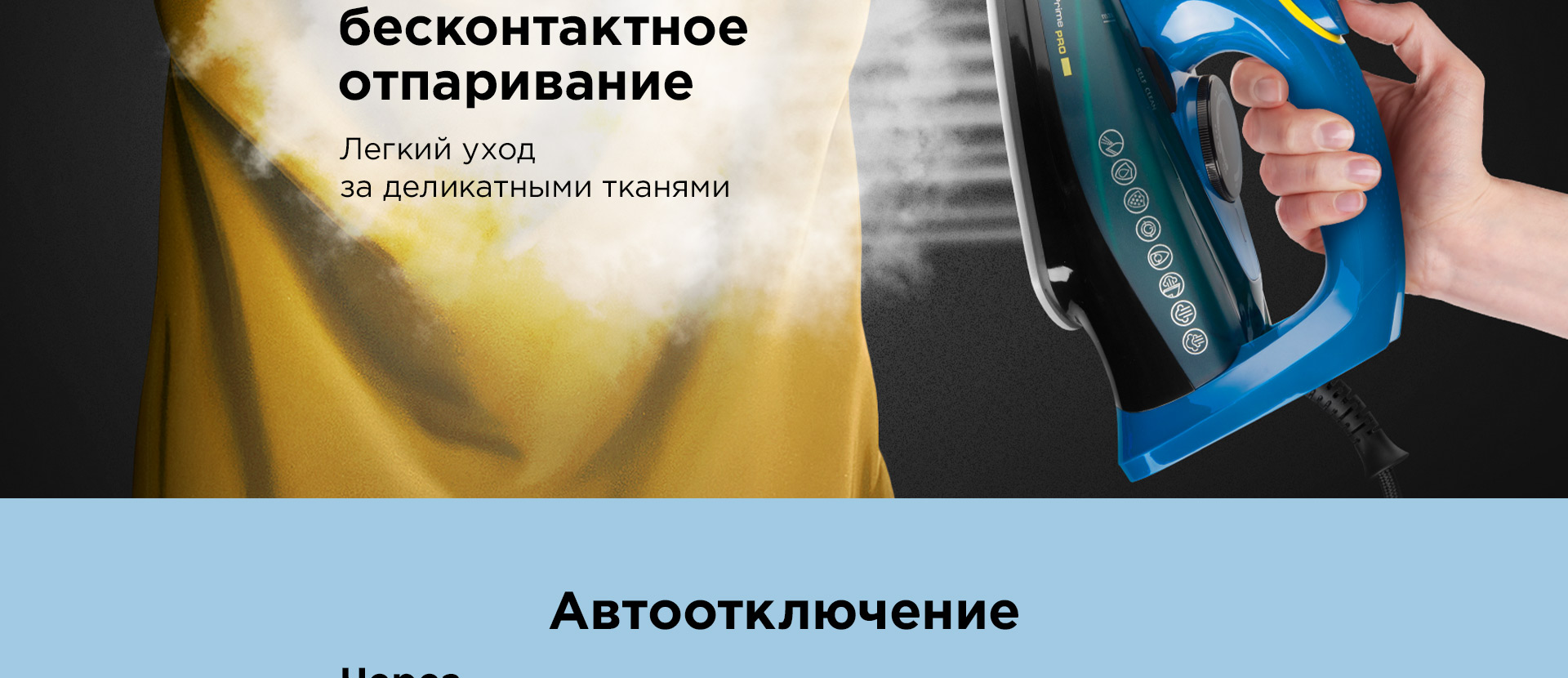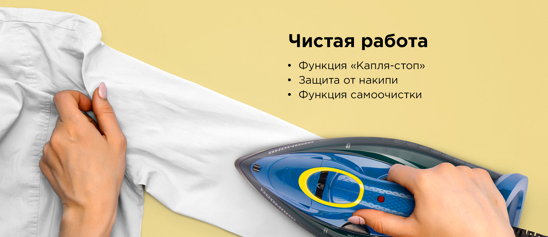 Часто при переключении режима отпаривания на сухое глажение из отверстий в подошве льется вода. Во избежание этого в модели предусмотрена система «Капля-стоп», которая предотвращает протечку. Вы можете гладить, не опасаясь, что на ткани останутся разводы.