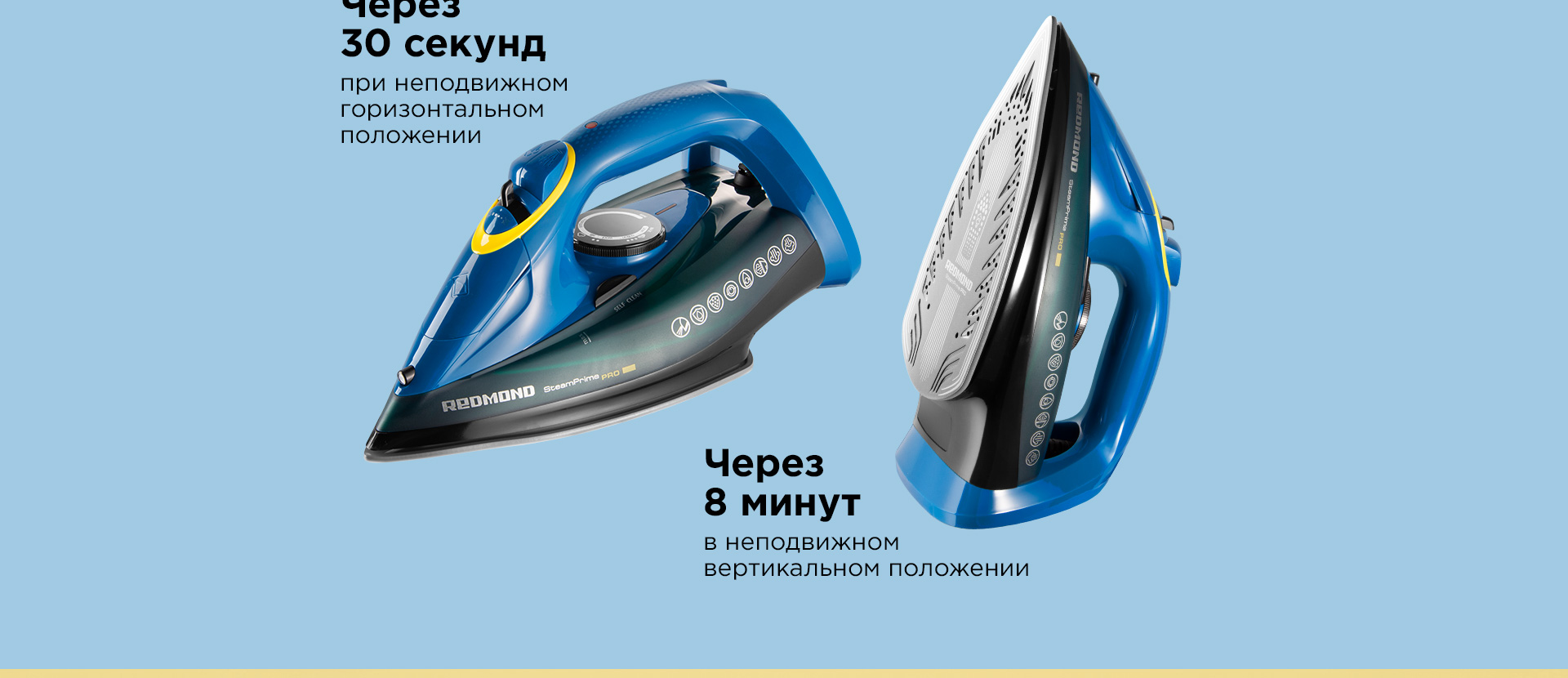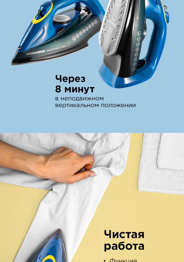 Утюг оснащен системой защиты, благодаря которой он автоматически перестанет работать, если вы забудете отключить его от сети. Нагрев прекращается, когда прибор стоит неподвижно в вертикальном положении более 8 минут, на подошве — более 30 секунд.