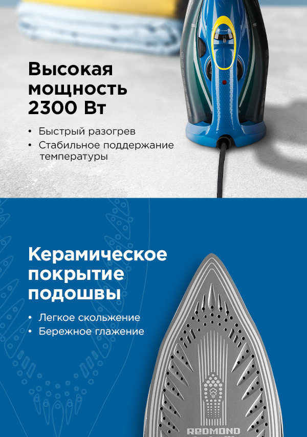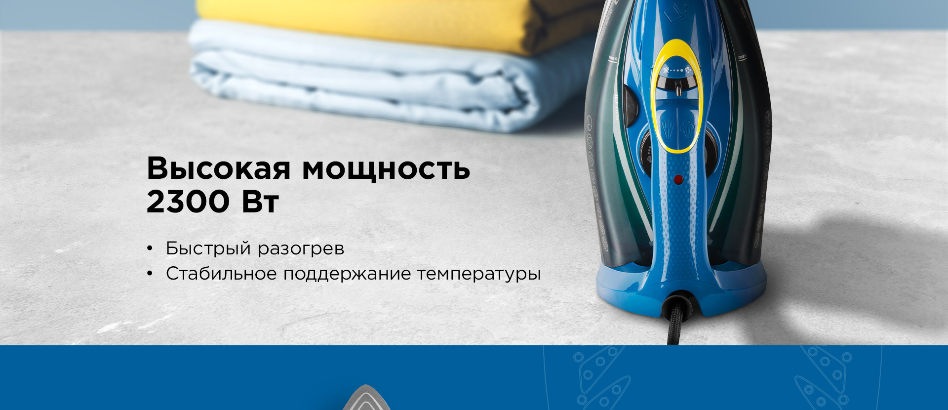 Мощность прибора в 2300 Вт обеспечивает быстрый нагрев и стабильное поддержание выбранной температуры, а также ускоренное парообразование в режимах глажения с паром.