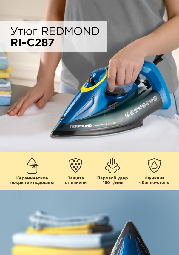 Утюг RI-C287 с подошвой улучшенного скольжения Boost Glide Pro и мощнейшим паровым ударом 150 г/мин поможет в уходе за одеждой из любых тканей – от нежного шелка до жесткого льна. Утюг оснащен всеми опциями для комфортного глажения и улучшен конструктивно: носик дополнительно сужен, чтобы вы могли без труда разгладить самые мелкие элементы одежды или декора на ней.