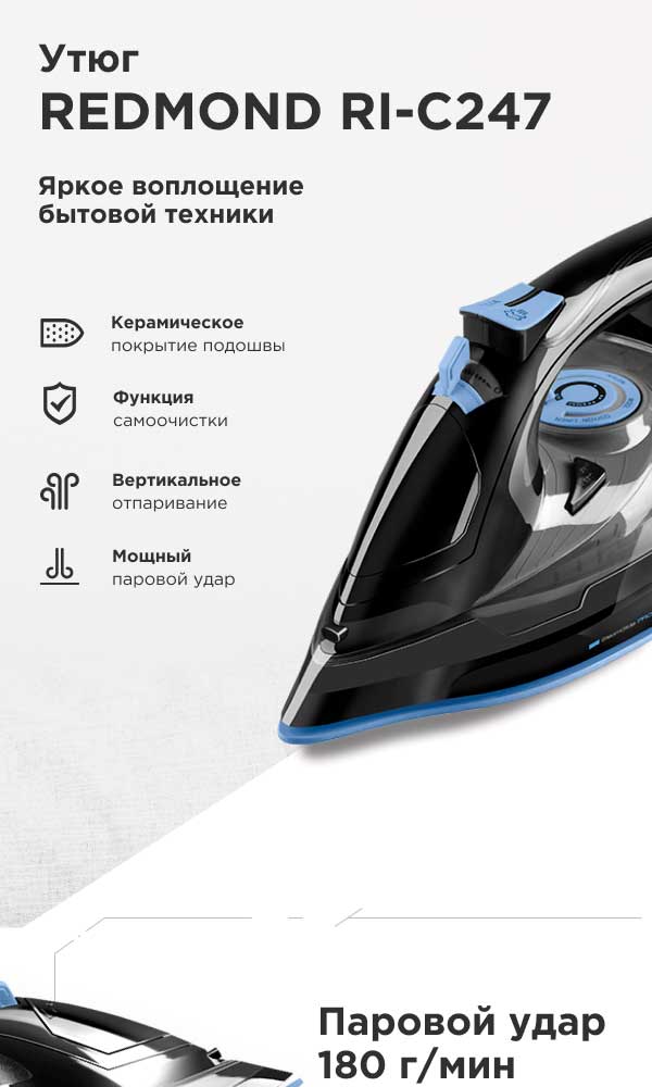 RI-C247 – утюг мощностью 2200 Вт с механической регулировкой нагрева подошвы и функцией автоматического отключения. Утюг REDMOND C247 сделает глажение легким и простым: вы быстро, без лишних усилий отгладите одежду, избавитесь из складок на скатерти, отпарите шторы и другой домашний текстиль.