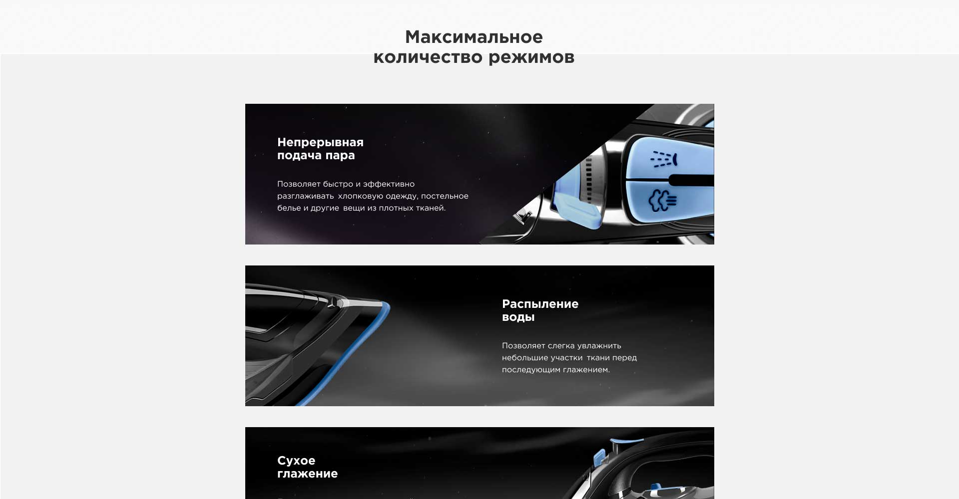 Режим постоянной подачи пара повышает эффективность утюжки. Горячий пар проникает глубоко в структуру ткани – вы легко разгладите даже сильные заломы и складки на одежде, отутюжите сильно смятые и/или пересушенные вещи.