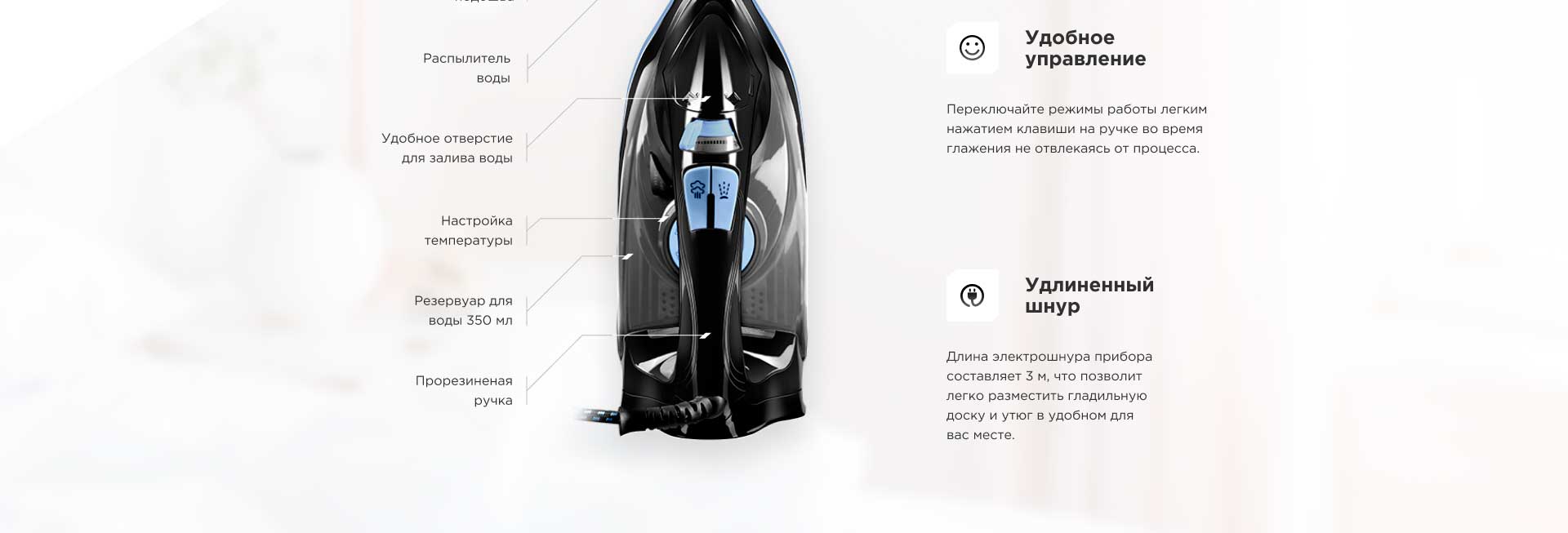 В модели предусмотрено 3 режима нагрева подошвы. Вы сможете выбрать оптимальную температуру для глажения акрила, шелка, вискозы, шерсти и других тканей. Температура настраивается при помощи поворотного регулятора, расположенного на корпусе. Чтобы вы могли быстро установить нужные настройки, на регулятор нанесены условные обозначения температурных режимов.