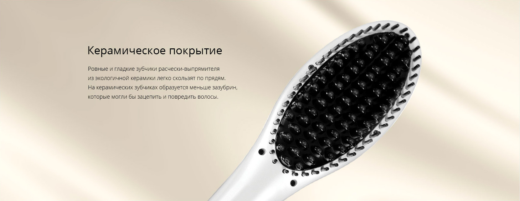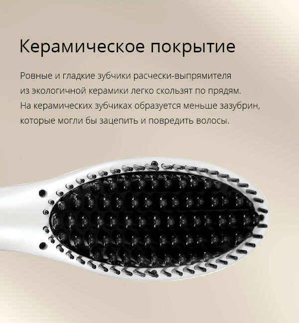 Покрытие зубцов выпрямителя-расчёски RCI-2316 – керамическое. При нагреве керамика не оказывает никакого негативного влияния на волосы и даже напротив – она считается одним из самых экологичных материалов для приборов красоты и здоровья. Тепло равномерно распределяется по керамических зубчикам выпрямителя-расчёски, позволяя избежать пересушивания волос.