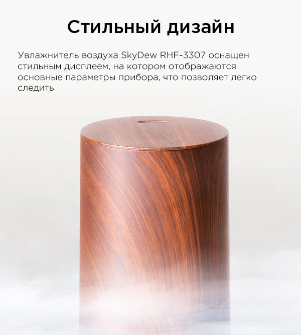RHF-3307 — ультразвуковой увлажнитель воздуха, который поможет создать комфортную атмосферу в доме. Несмотря на небольшие габариты, прибор эффективно увлажняет воздух в помещениях площадью до 45 м². Необычный дизайн в стиле «хюгге» с отделкой под дерево делают прибор стильным дополнением современного интерьера.