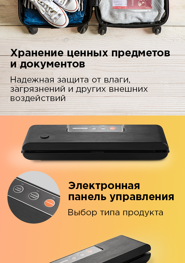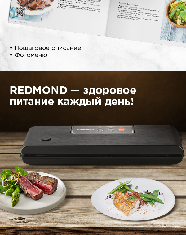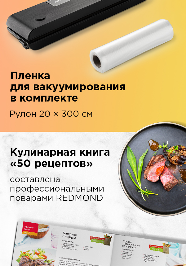 REDMOND RVS-022 – прибор, предназначенный для упаковывания продуктов в специальную вакуумную пленку. С помощью RVS-022 вы сможете подготовить продукты для длительного хранения, а также для приготовления блюд по технологии су-вид.