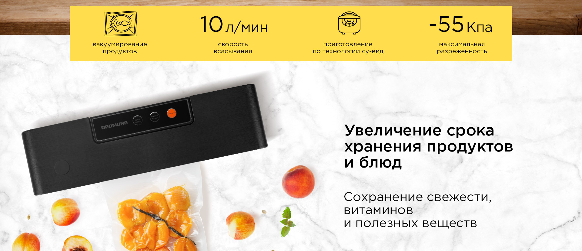 С помощью RVS-022 вы быстро и легко упакуете продукты для приготовления блюд по популярной в современных ресторанах технологии су-вид (фр. sous-vide – под вакуумом). Благодаря медленной низкотемпературной обработке и отсутствию кислорода ингредиенты сохраняют текстуру и все натуральные соки. Даже жесткое мясо, приготовленное таким методом, получается изумительно нежным и сочным.