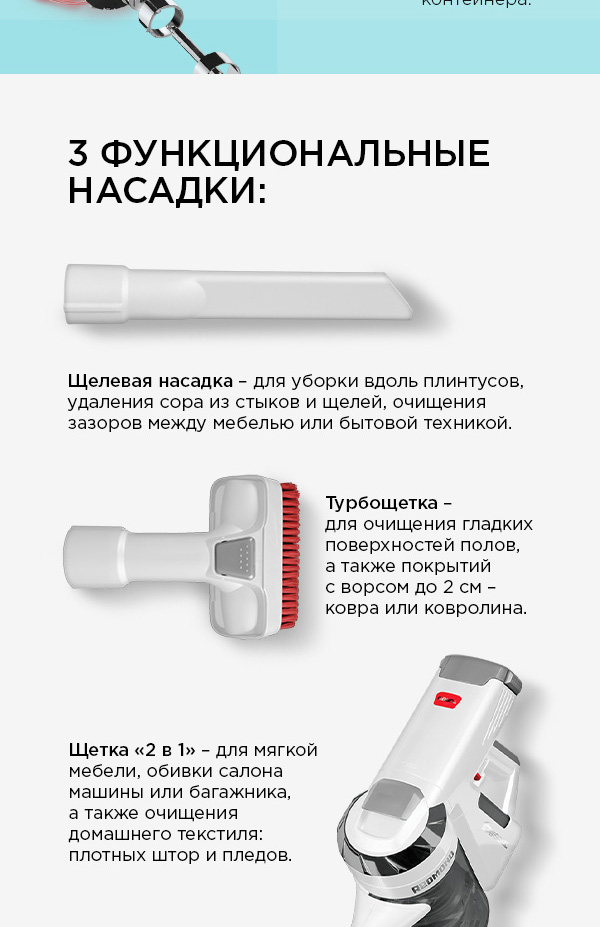 • универсальная насадка «2 в 1» – удобна для очистки мебели, автомобильных сидений;