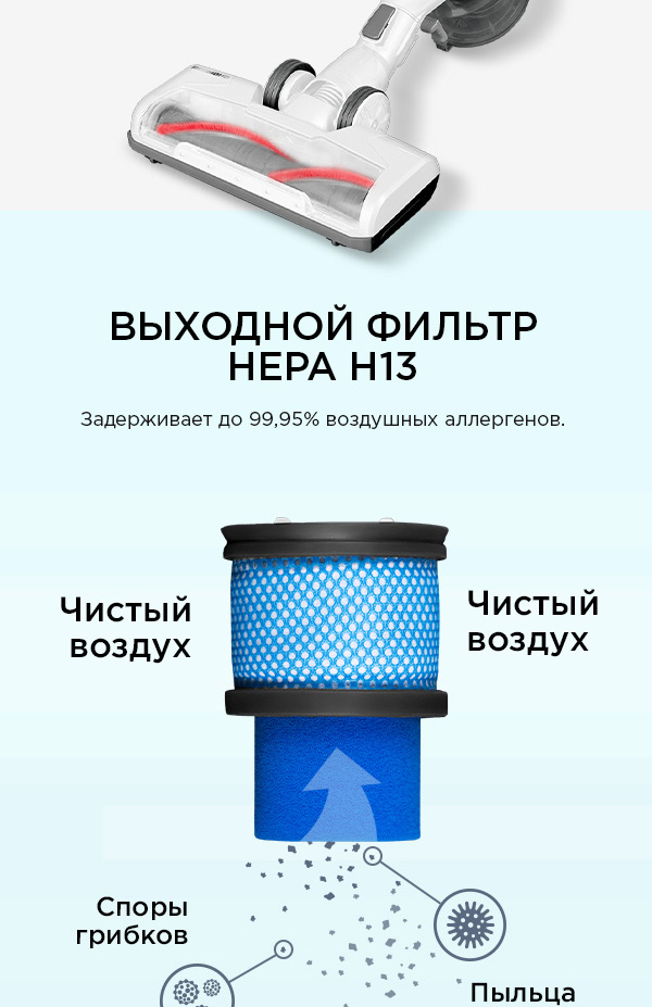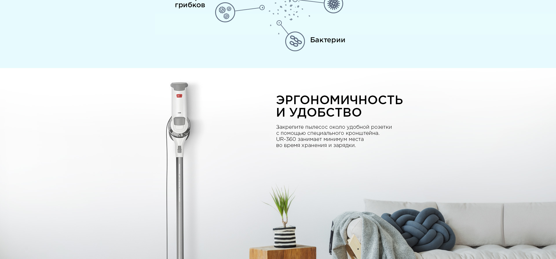 Вертикальный пылесос оснащен HEPA-фильтром класса Н13 с волокнами тонкой структуры. Задерживает 99,95% мелкодисперсной пыли и содержащихся в ней аллергенов. UR360 сохраняет ее внутри контейнера, система фильтрации не позволяет пылевым частицам попадать обратно в воздух.
