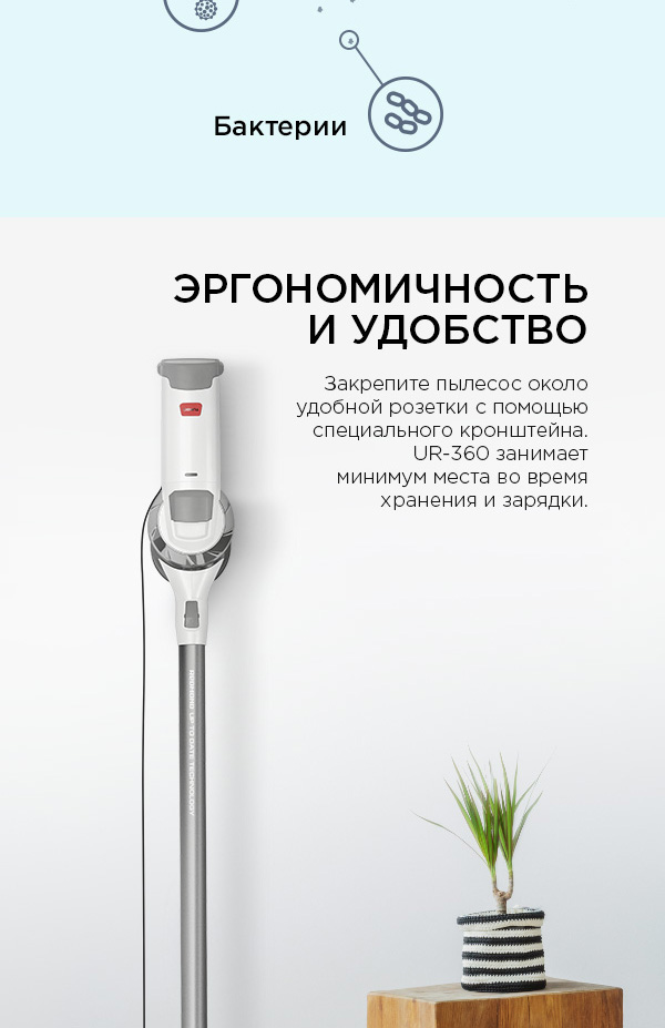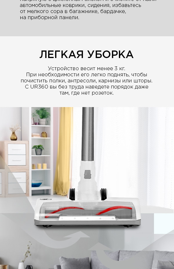 Компактный пылесос UR360 работает от аккумулятора, с его помощью вы без труда наведете порядок дома, избавитесь от пыли, мусора даже там, где нет розеток. Поддерживайте чистоту каждый день там, где это нужно: в ванной, коридоре, гардеробной, на лоджии или лестнице. Пылесосьте любые, даже самые труднодоступные участки вашего жилища.