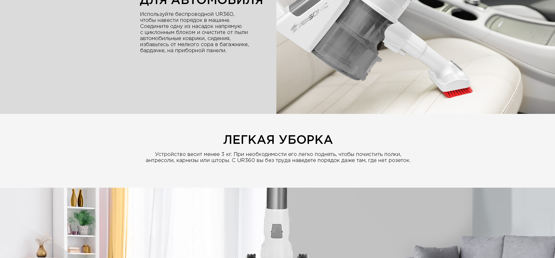 Нужно срочно убрать шерсть домашних питомцев с дивана, песок с пола в коридоре, собрать крошки на кухне? Снимите UR360 с подставки, выберите нужную насадку и приступайте к работе. Вам не придется собирать пылесос, включать его в розетку, а шнур питания не будет мешать под ногами.