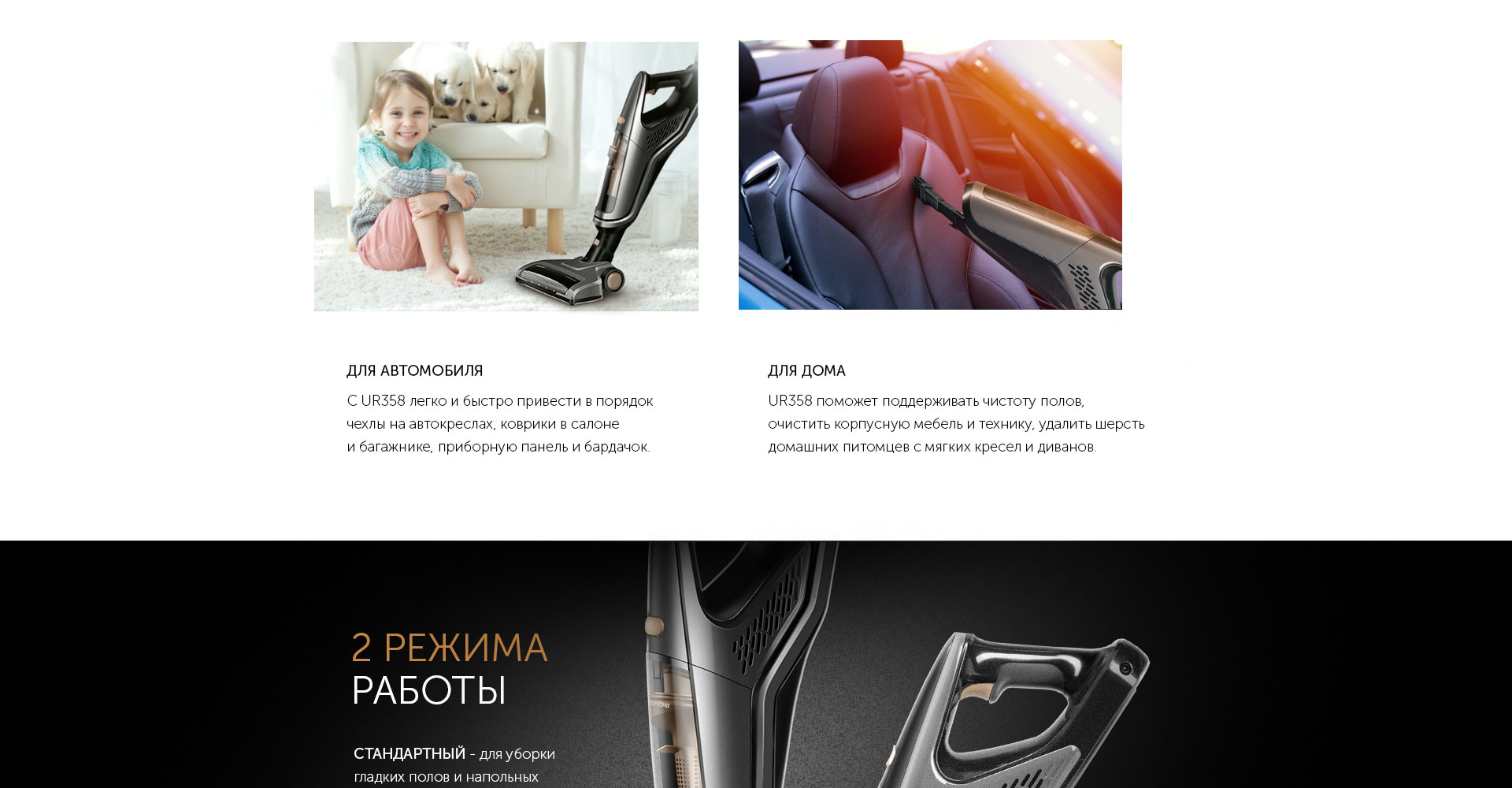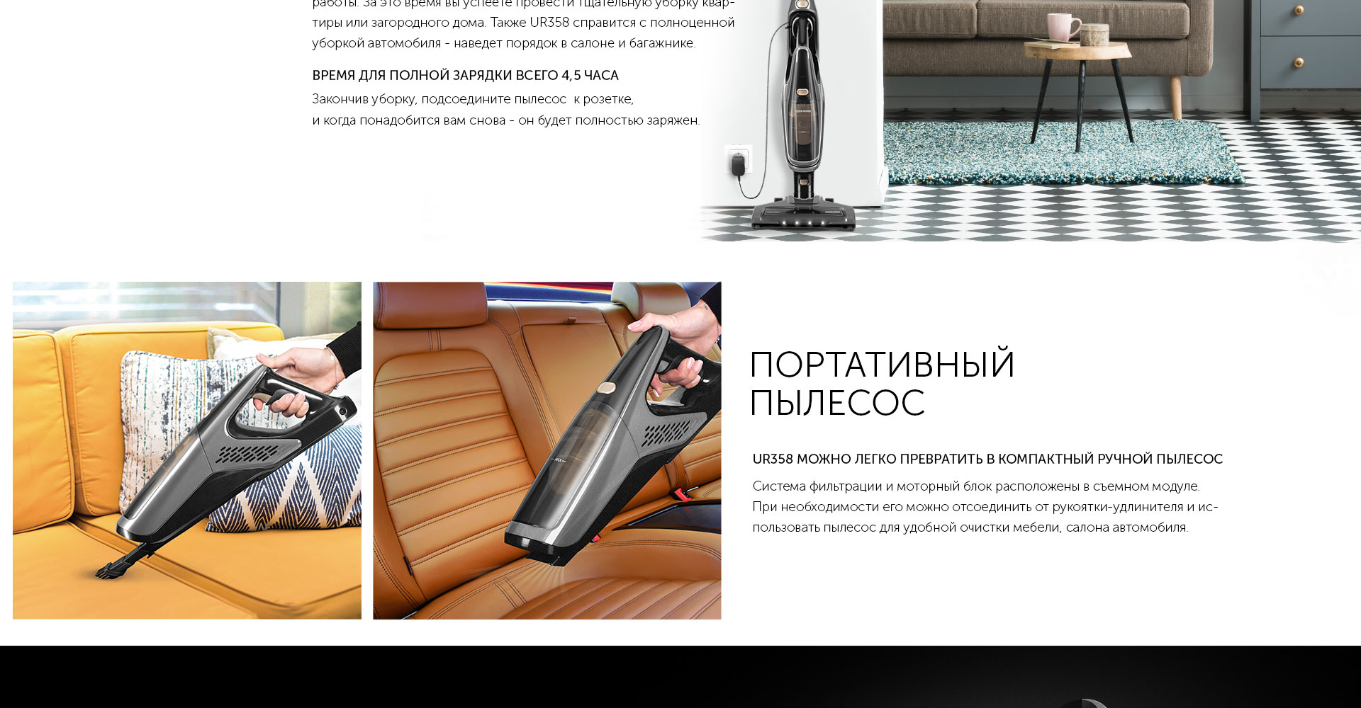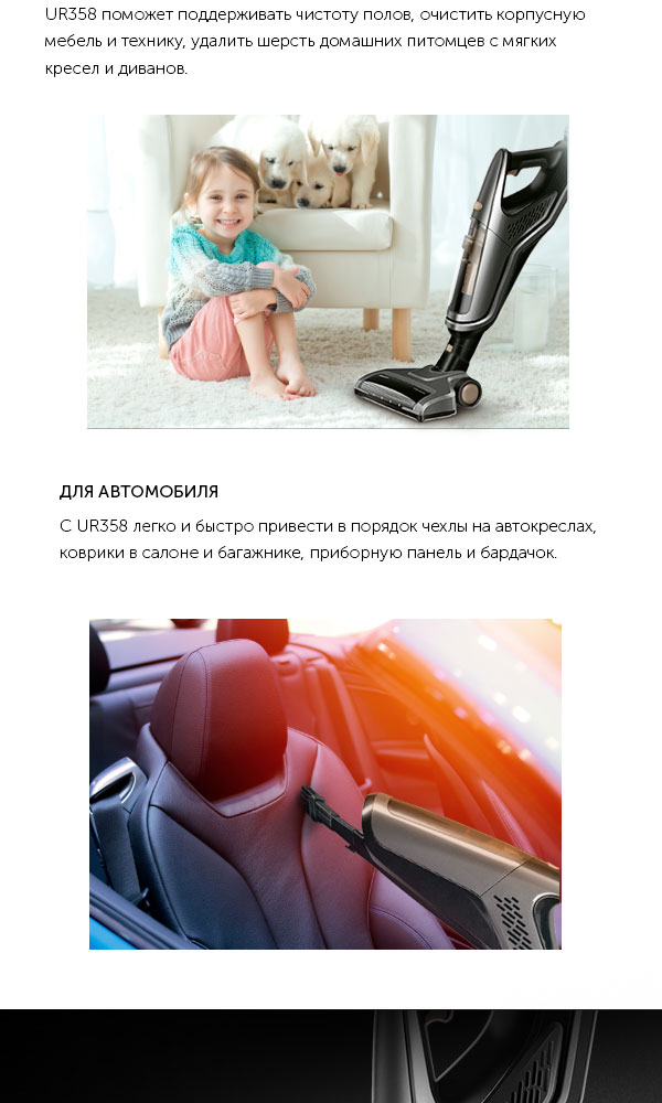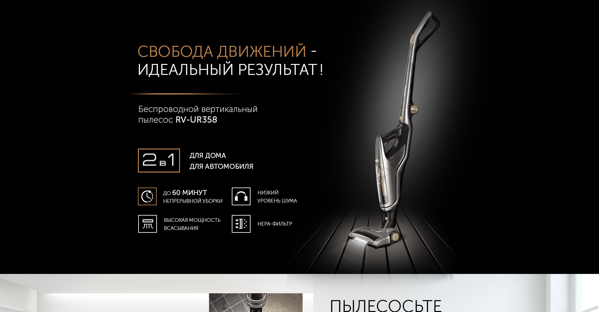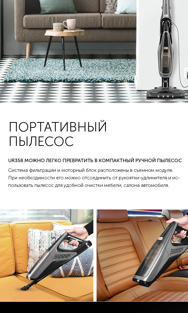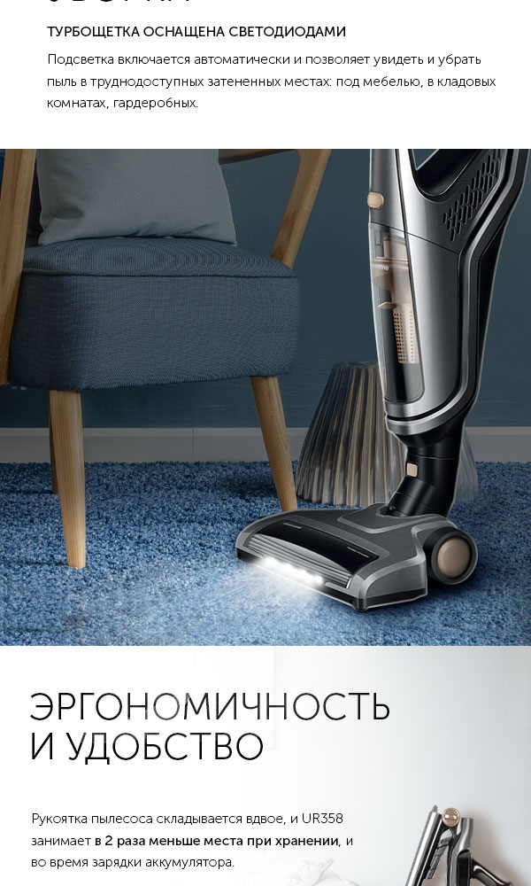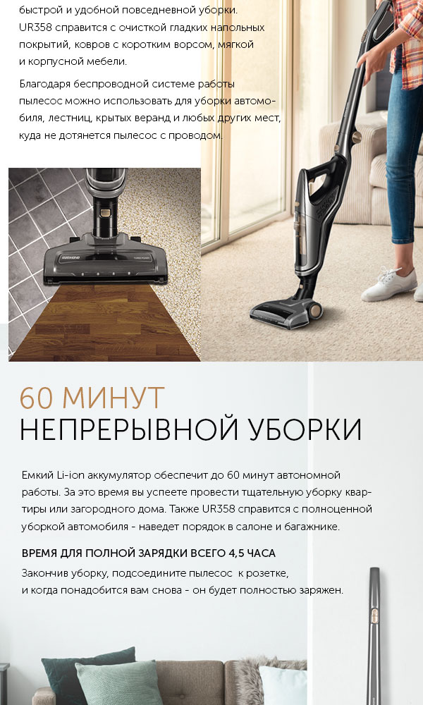 RV-UR358 эргономичный и легкий: он не требует сборки и его не нужно подключать к розетке. Любимый питомец оставил в прихожей песок после прогулки? Просто возьмите пылесос и нажмите на кнопку – уборка сора займет меньше минуты!