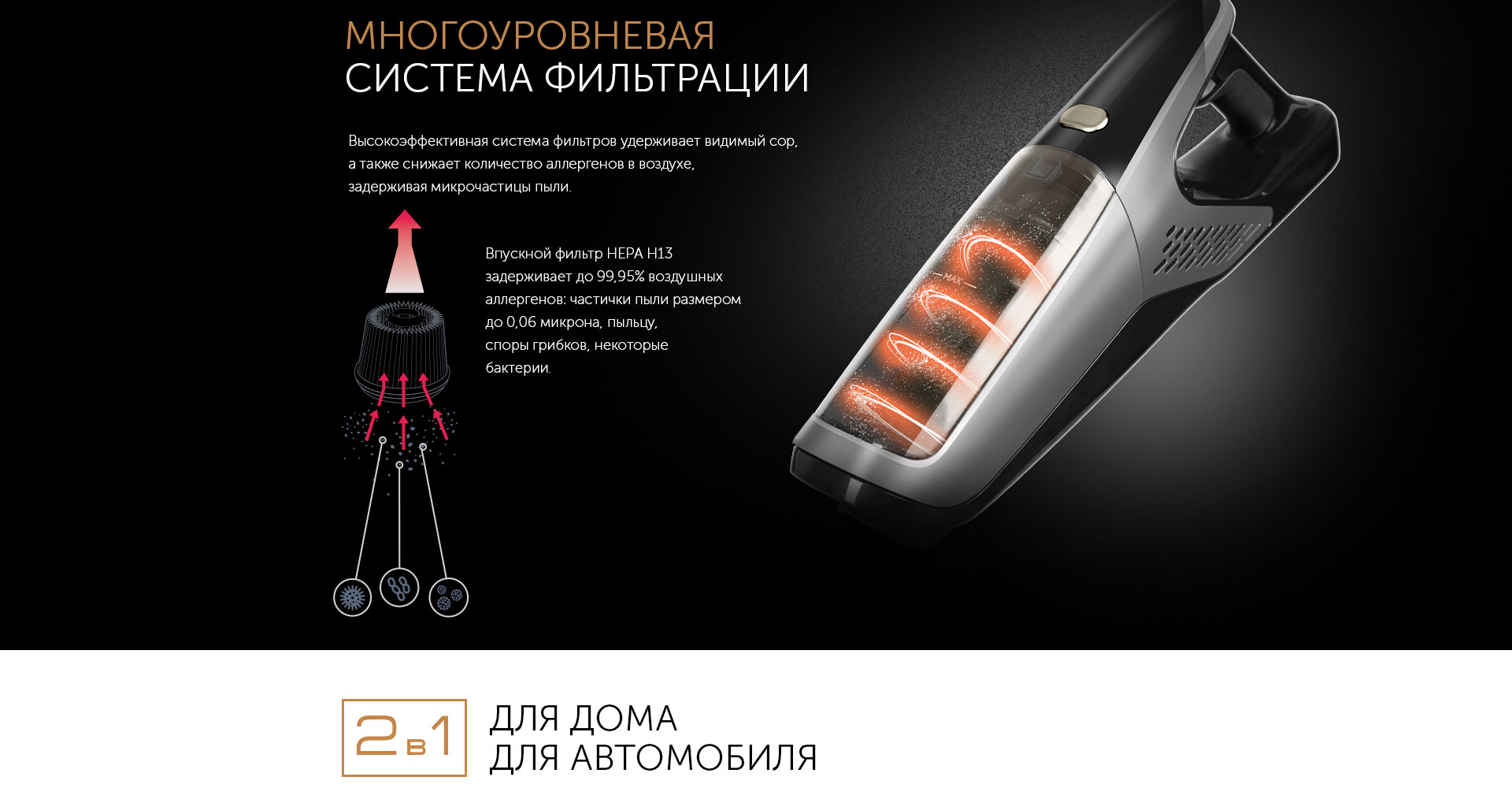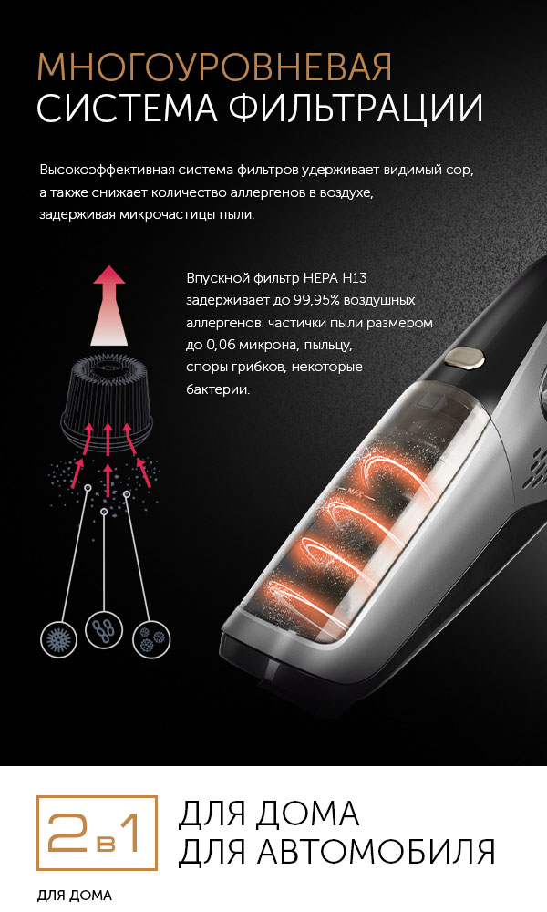 RV-UR358 легко превращается в компактный ручной пылесос. Отсоедините от корпуса моторный блок и установите на него комплектную насадку «2 в 1». RV-UR358 поможет вам поддерживать порядок в салоне и багажнике автомобиля: очистить кресла, стыки между ними, приборную панель и бардачок. Если во время поездки ребенок накрошил на сиденье печенье, вы быстро уберете все крошки с помощью ручного пылесоса.