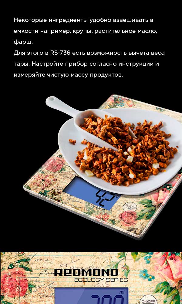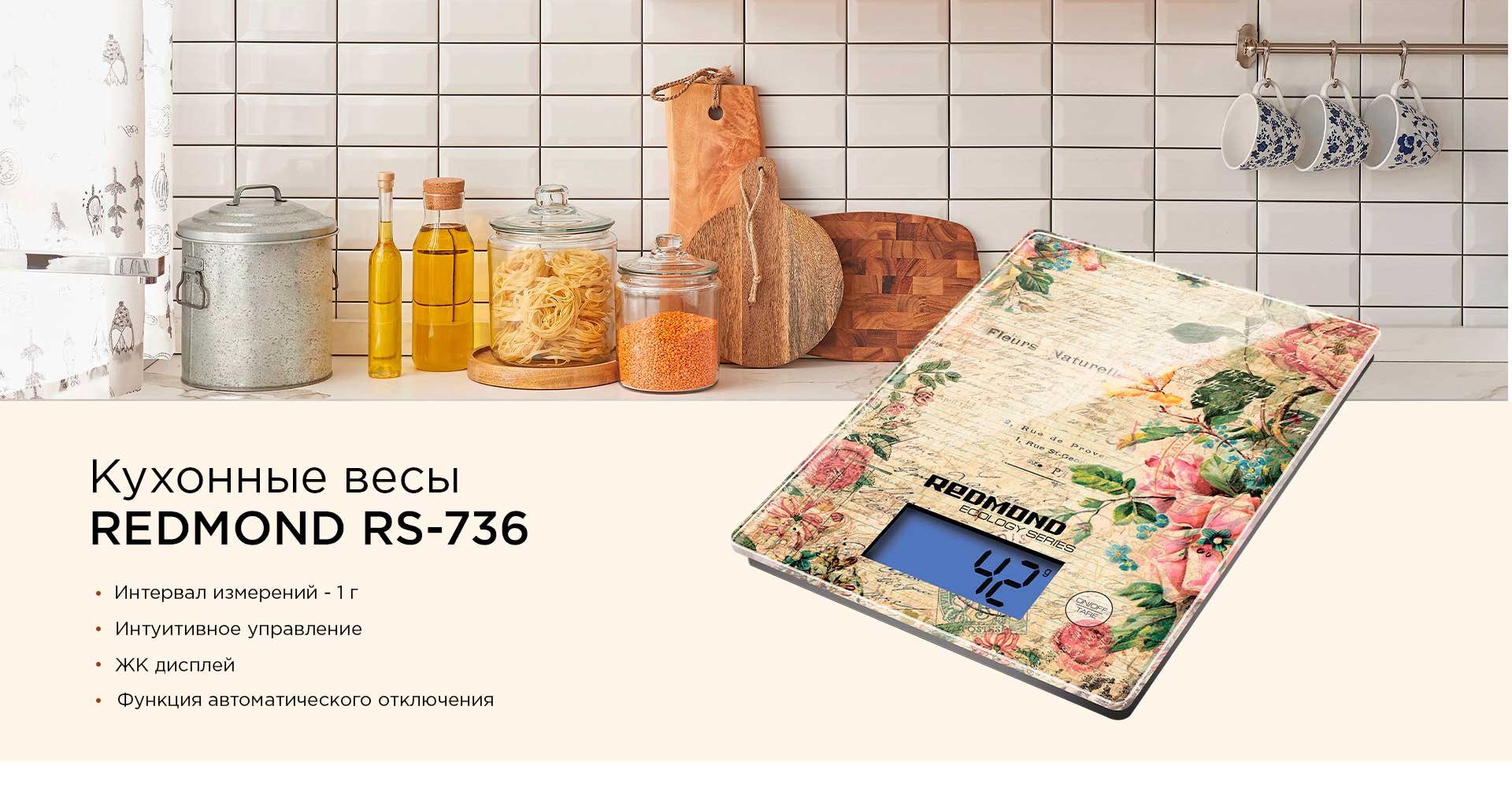 Кухонные весы REDMOND RS-736 — новинка из экологичной серии с платформой из закалённого стекла, сенсорной панелью управления, ЖК-дисплеем с подсветкой и функцией автоотключения. Прибор можно хранить, повесив на крючок.