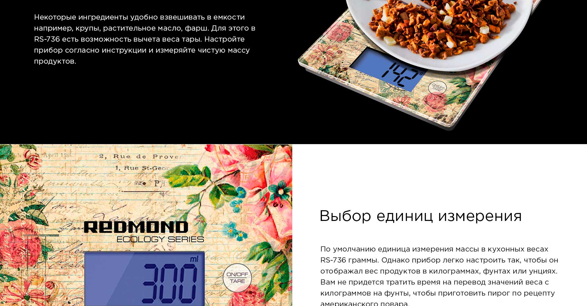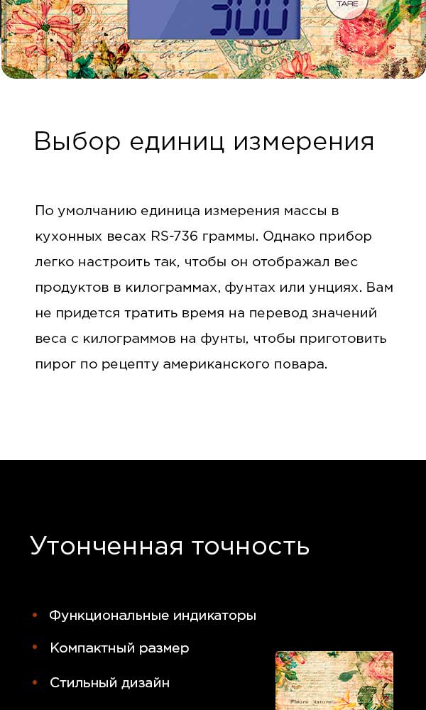 Кухонные весы RS-736 с функцией вычета веса тары имеют четыре единицы измерения – грамм / жидкая унция / миллилитр / фунт. Диапазон измерения – от пяти граммов до восьми килограммов. Прибора дополнительно оснащён индикацией низкого уровня заряда и перегрузки.