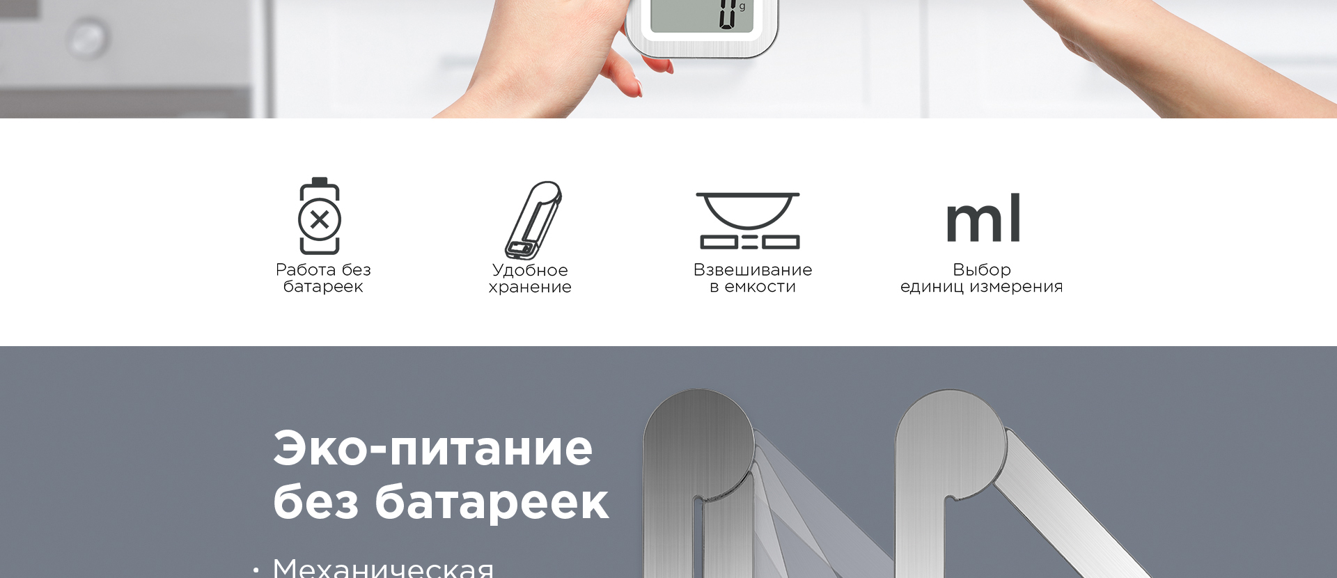 В RS-758 предусмотрена уникальная система зарядки – чтобы обеспечить работу прибора в течение 3-х минут, откройте, сложите и еще раз откройте. Весы не требуют использования батареек, что значительно упрощает их эксплуатацию. Индикация уровня заряда подскажет, если необходимо еще раз произвести открытие-закрытие прибора для механической подзарядки.
