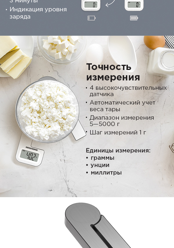 За высокую точность измерения отвечают 4 высокочувствительных датчика. RS-758 позволяют измерять продукты весом от 5 г до 5 кг с шагом в 1 г. Также в RS-758 предусмотрен учет веса тары. При перегрузке индикатор на дисплее подскажет о превышении максимально допустимого веса.