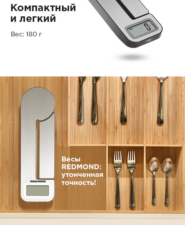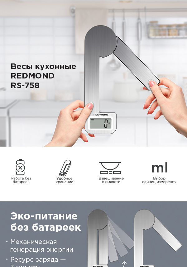 Складные кухонные весы REDMOND RS-758 – это высокоточное миниатюрное сенсорное устройство для измерения веса продуктов, выполненное в ультрасовременным дизайне.
