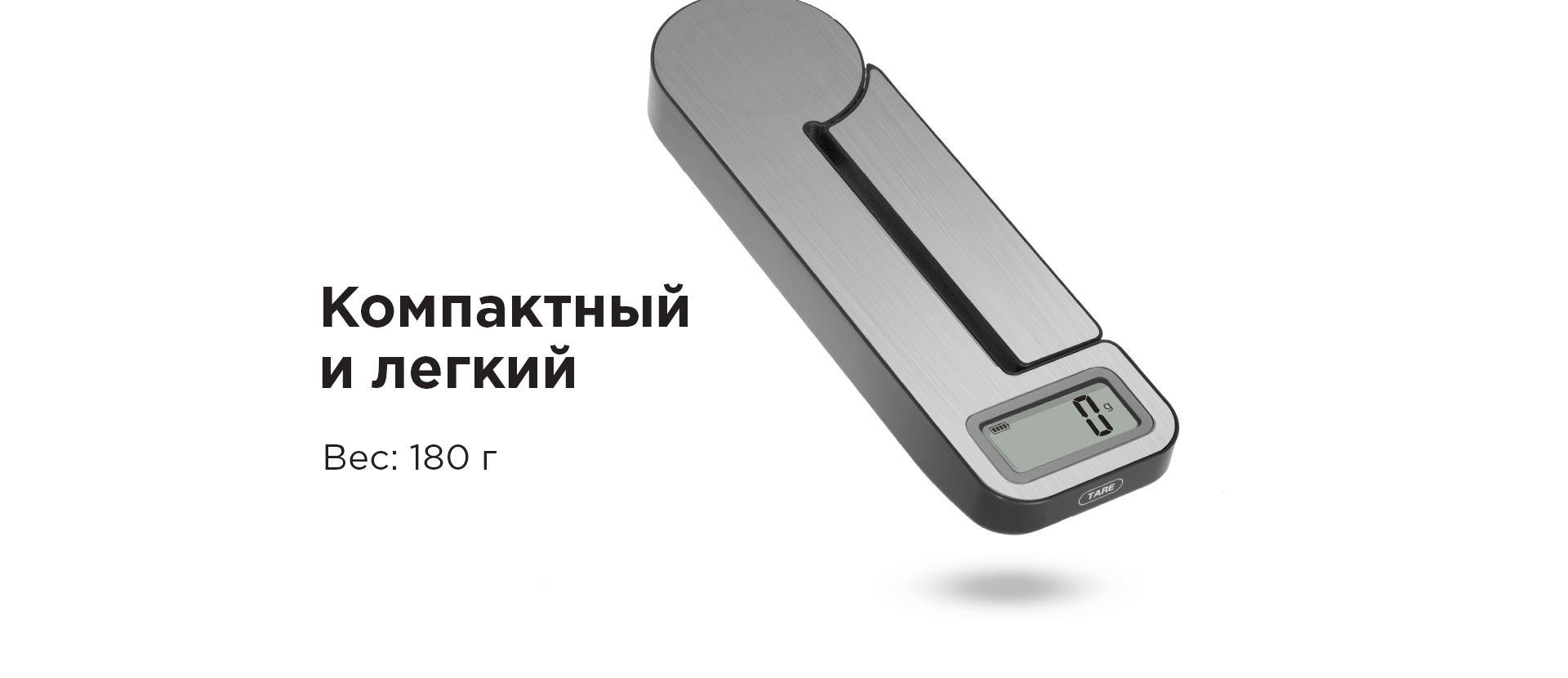 В сложенном виде размер RS-758 не превышает 22х6,6 см, а вес прибора составляет всего 180 г. Устройство можно использовать как в сложенном, так и в разложенном виде. Ингредиенты в мелкой таре установите на сложенные лучи весов из нержавеющей стали, а для взвешивания продуктов в большей емкости раскройте подвижную часть, увеличив полезную площадь прибора.