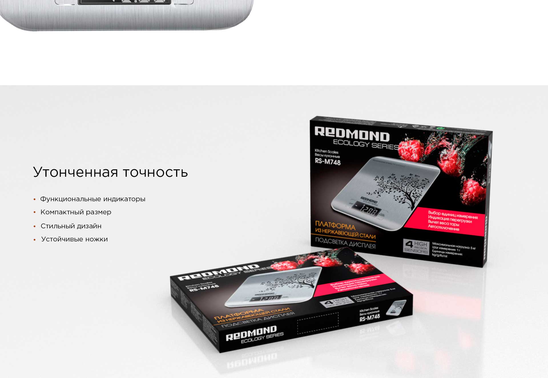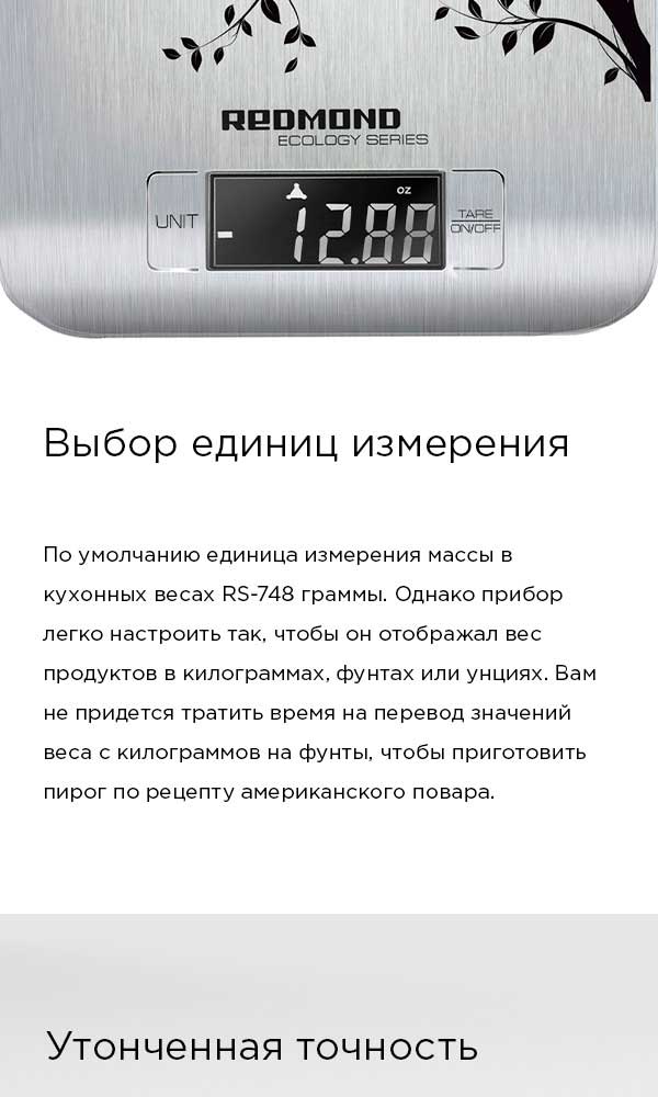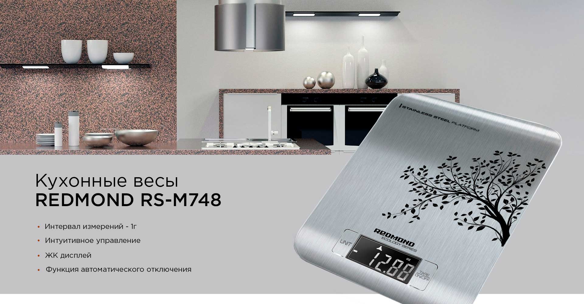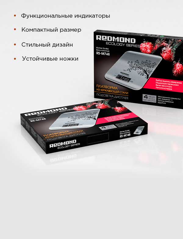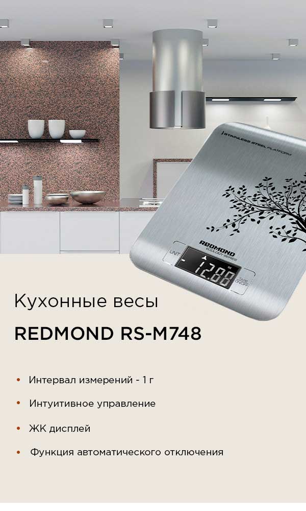 РЕДМОНД RS-M748 – это современные кухонные весы с корпусом из нержавеющей стали и ЖК-дисплеем. Стильная модель с изящным рисунком прекрасно подойдет к любому интерьеру.