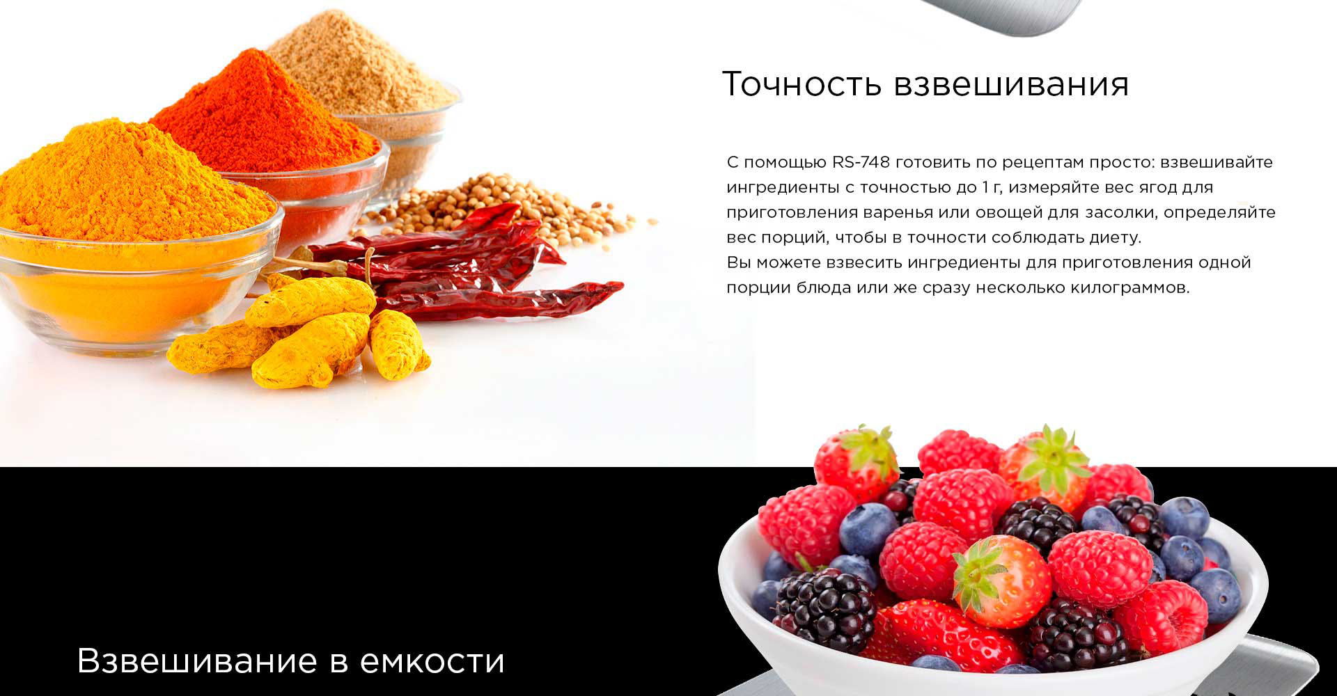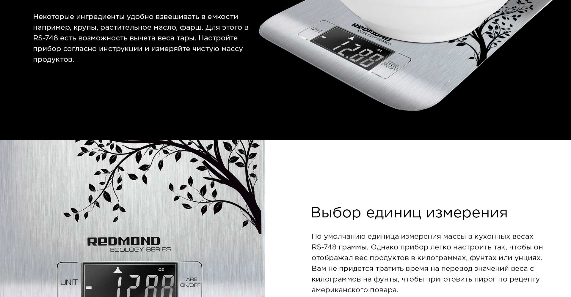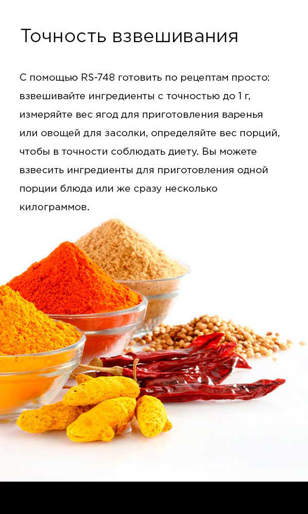 С RS-M748 можно взвешивать сыпучие или жидкие продукты прямо в тарелке: для этого просто установите пустую тару на весы, нажмите кнопку на панели прибора, и значение веса обнулится.