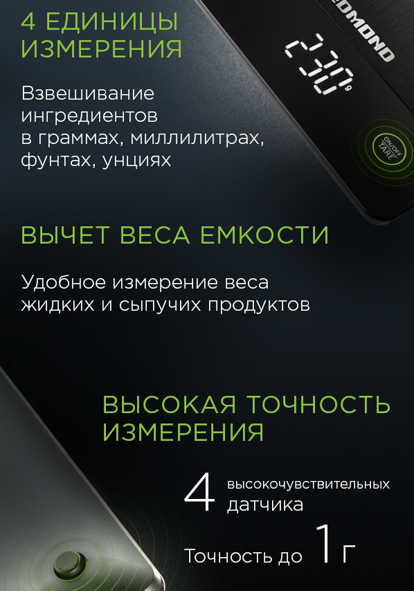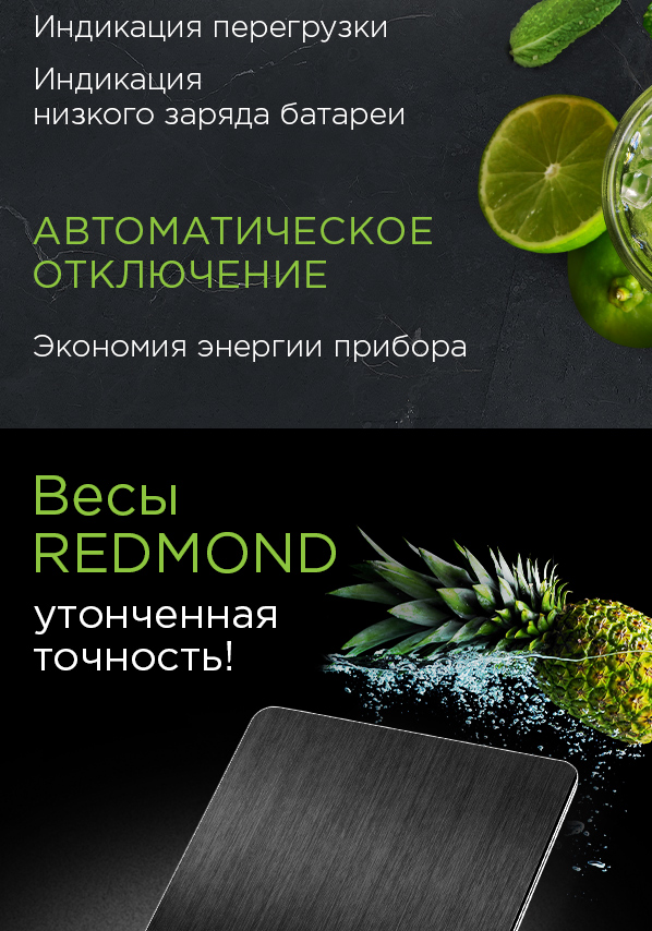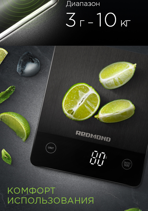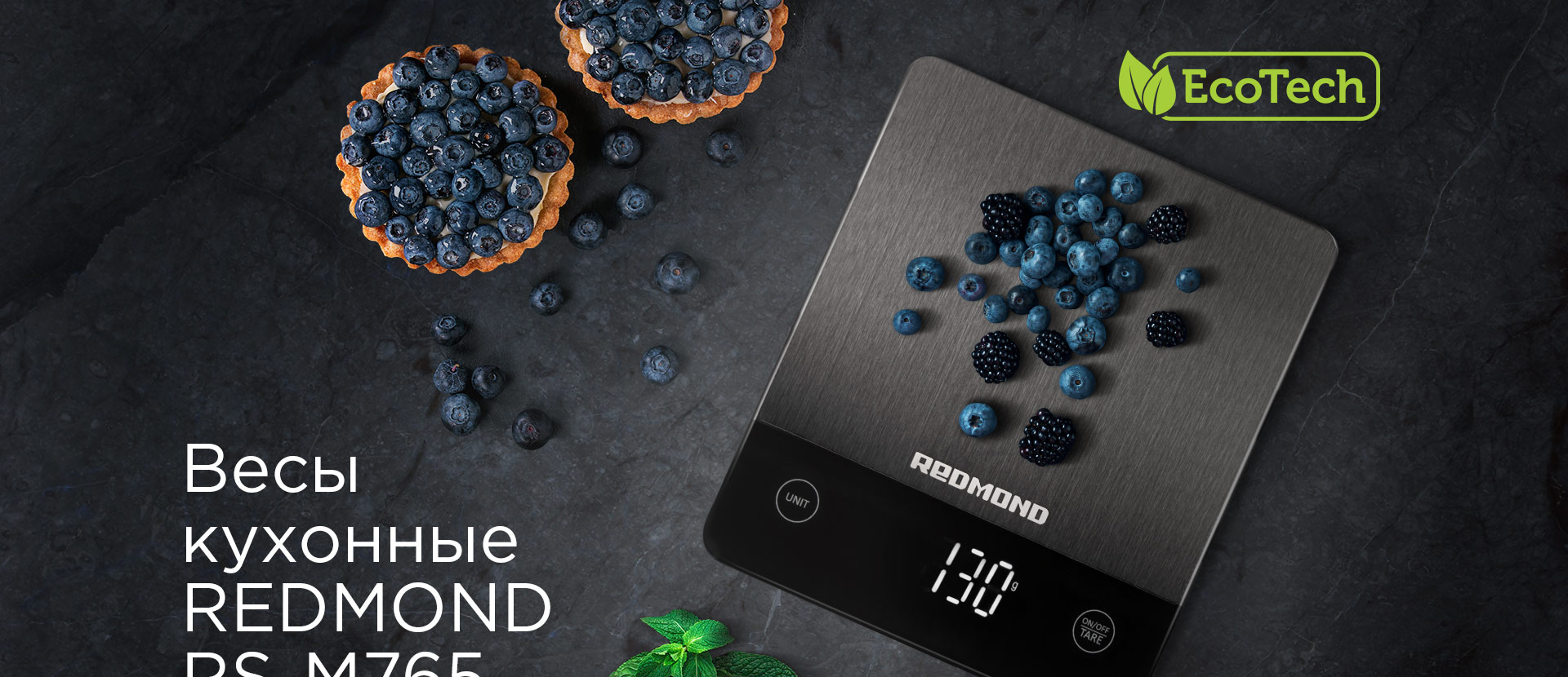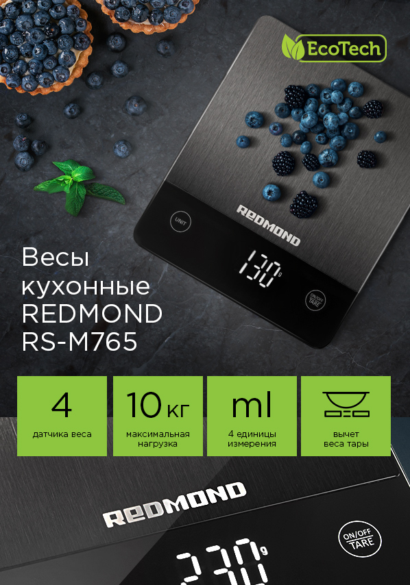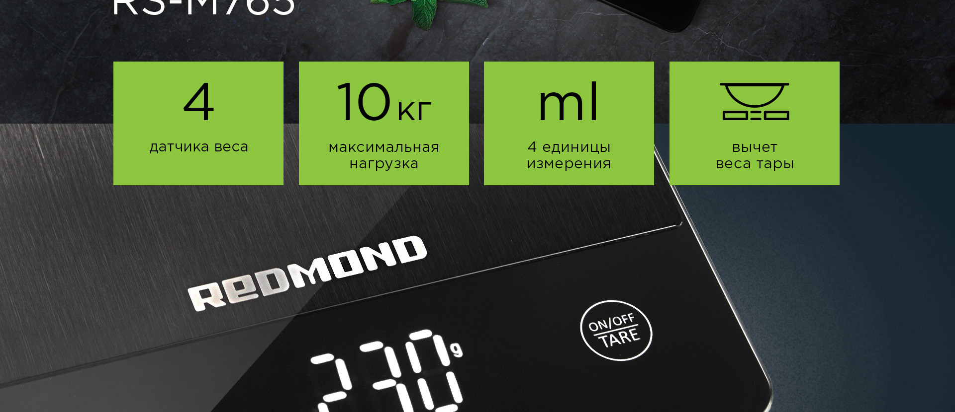 Кухонные весы REDMOND RS-M765 — компактный прибор, оснащенный высокочувствительными датчиками и функцией вычета веса тары, который поможет быстро и точно взвесить ингредиенты для блюд.