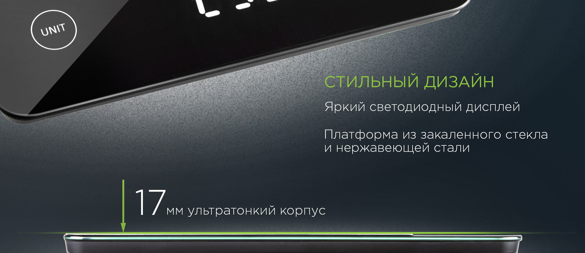 Модель отличается стильным минималистичным дизайном. Платформа весов выполнена из прочного закаленного стекла и нержавеющей стали черного цвета. На большом светодиодном дисплее отображаются результаты измерения.