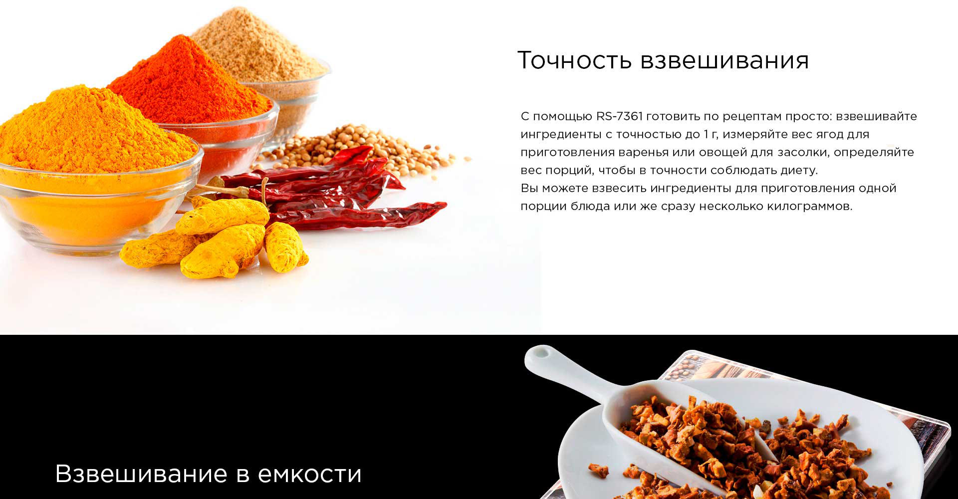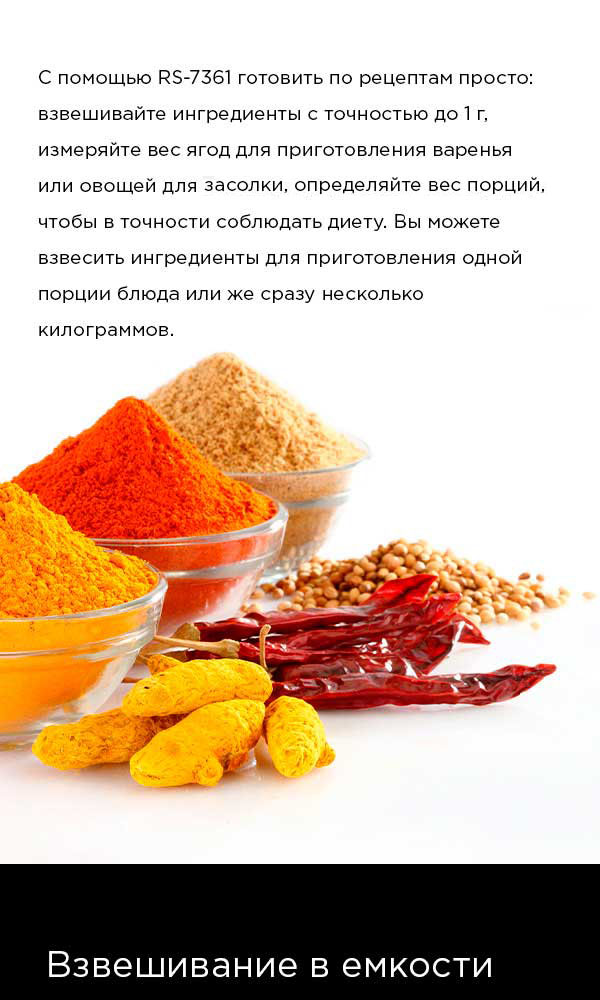 Кухонные весы RS-7361 взвешивают с точностью до 1 грамма. Благодаря этому вы можете правильно подобрать для блюда ингредиенты, указанные в рецепте в небольших количествах, в частности: специи и другие кулинарные добавки.