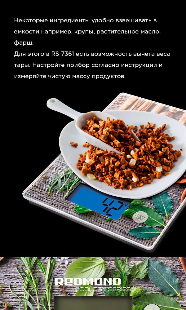 Весы кухонные REDMOND RS-7361 – современная модель весов с принтованной платформой из стекла, функцией вычета тары и диапазоном взвешивания от 5 г до 8 кг.