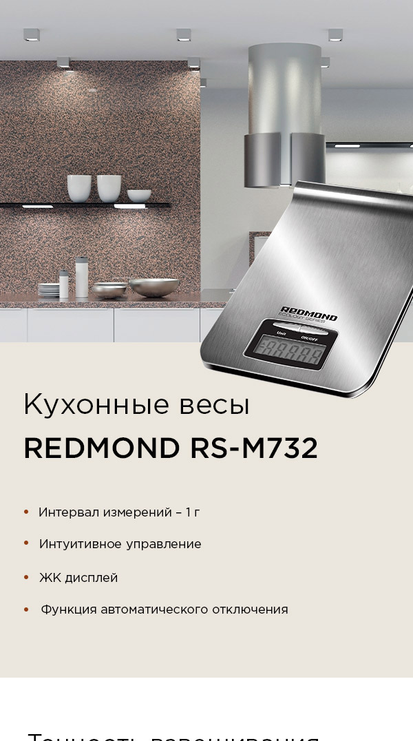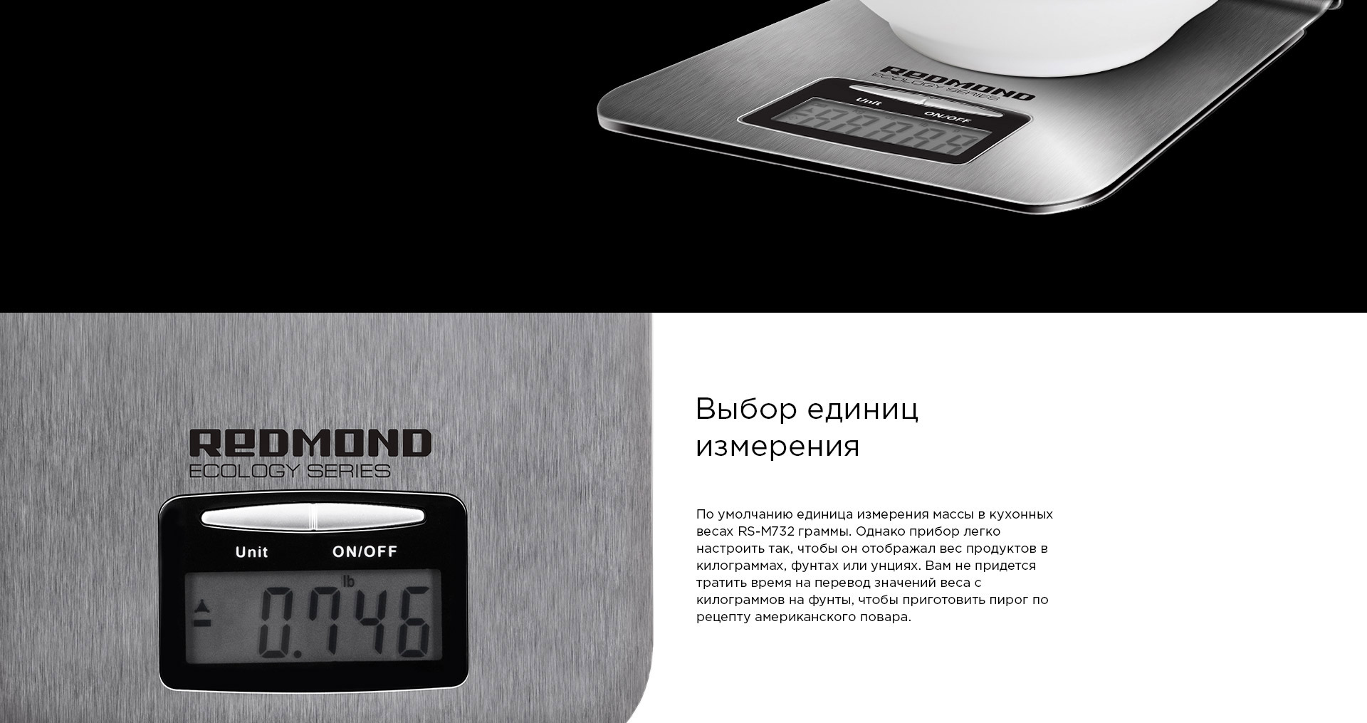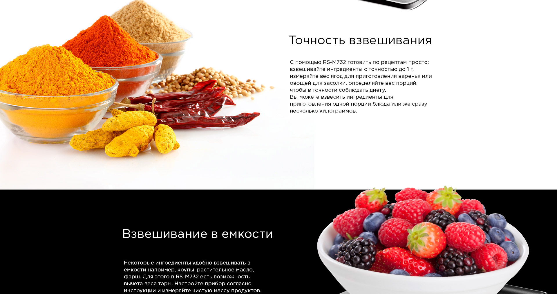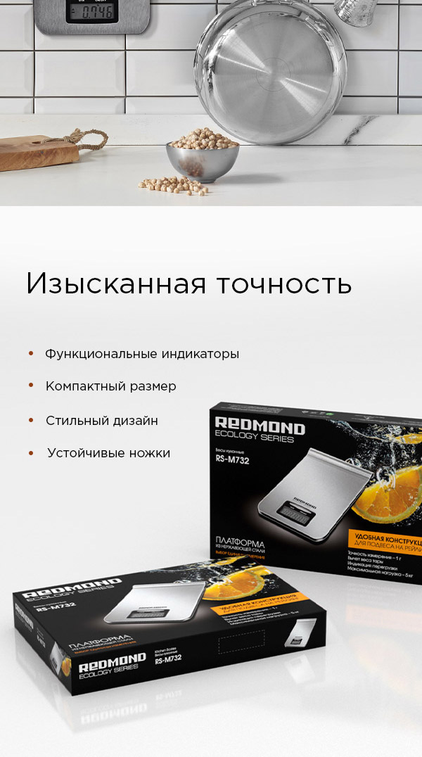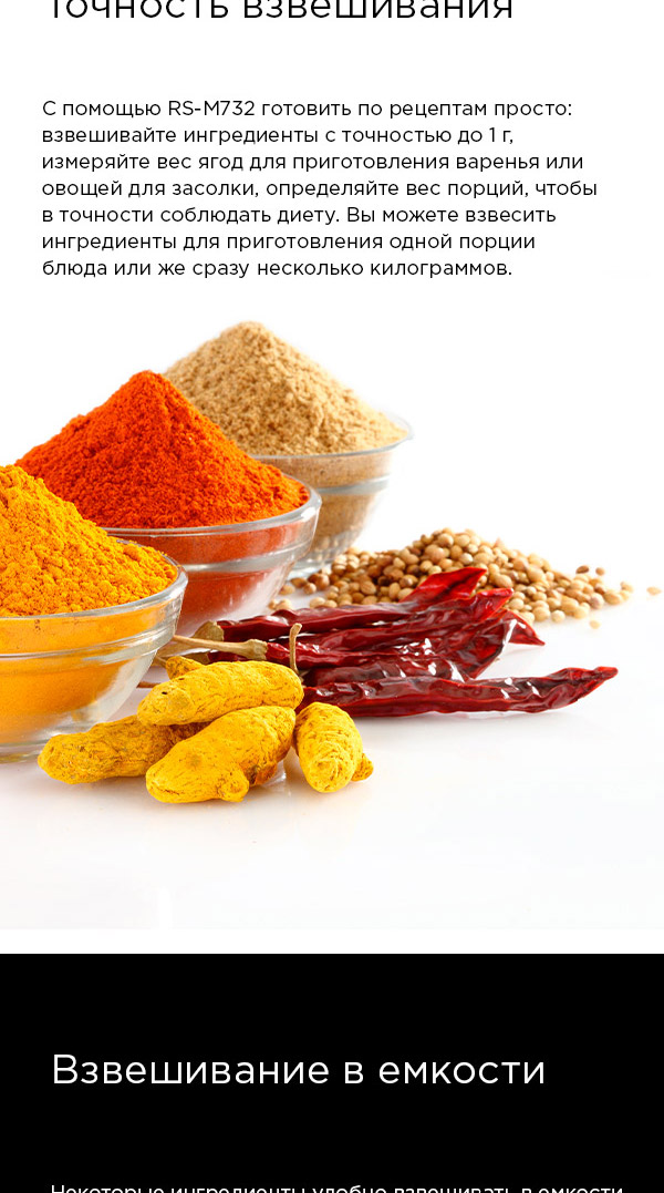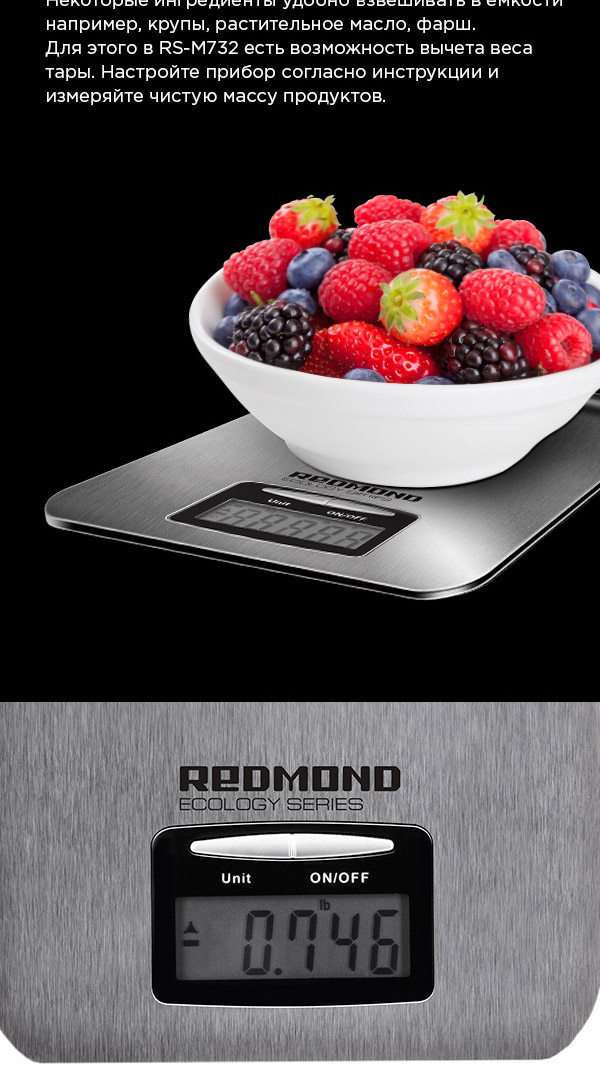 В кухонных весах RS-M732 есть функция вычета веса тары. Чтобы точно узнать массу продукта, поставьте тару на весы и вычтите ее вес ‒ весы покажут только массу самого продукта.